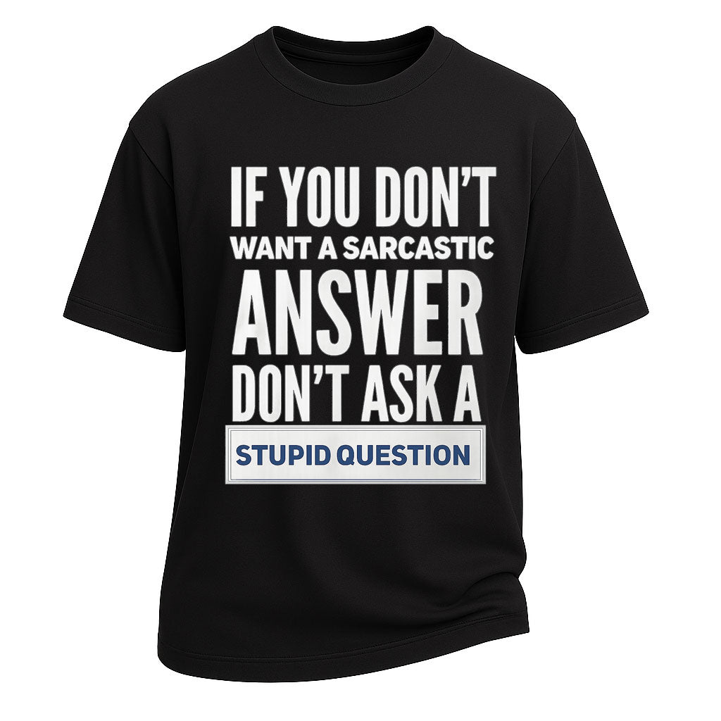 Say it like it is with this bold typographic tee: “If You Don’t Want a Sarcastic Answer, Don’t Ask a Stupid Question.” The statement is printed in bright white and navy blue for high contrast and maximum snark. Made from 100% cotton, with 260G heavyweight fabric—comfortable, durable, and built to last.