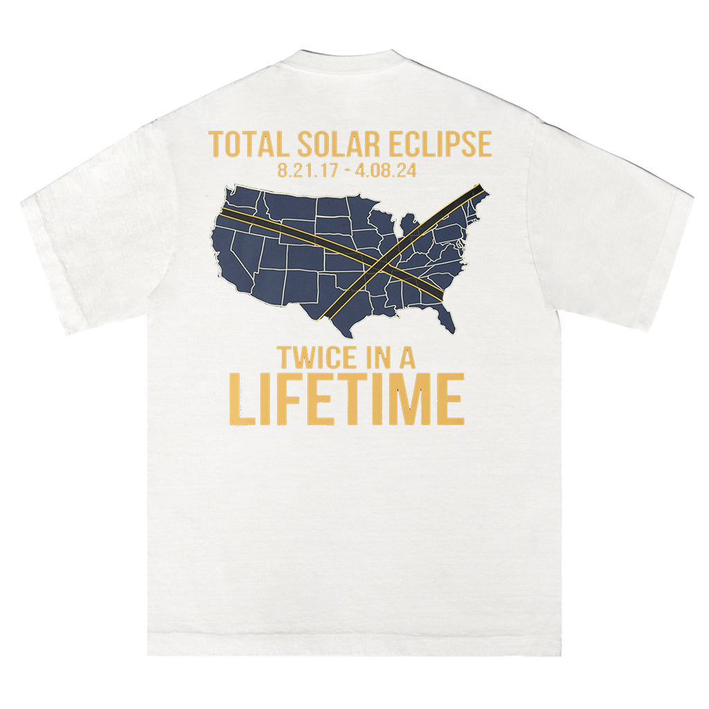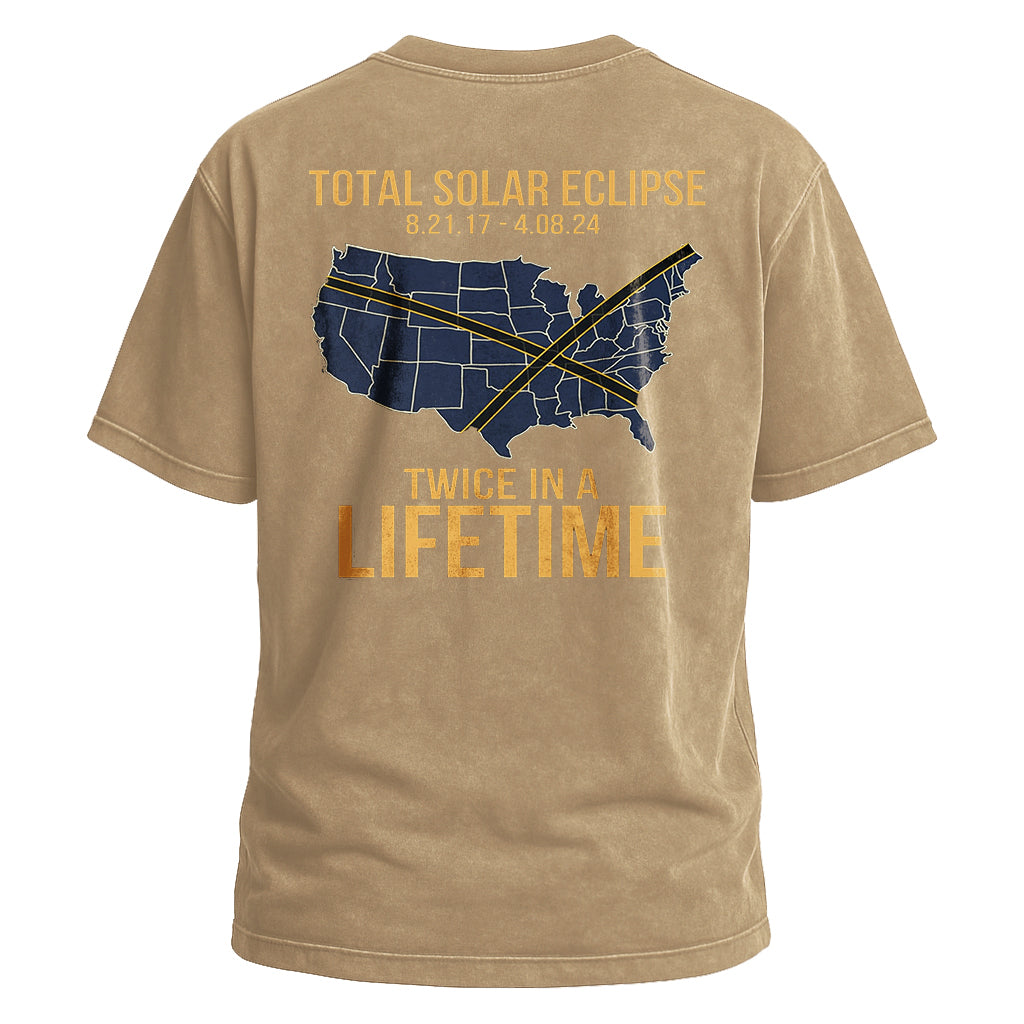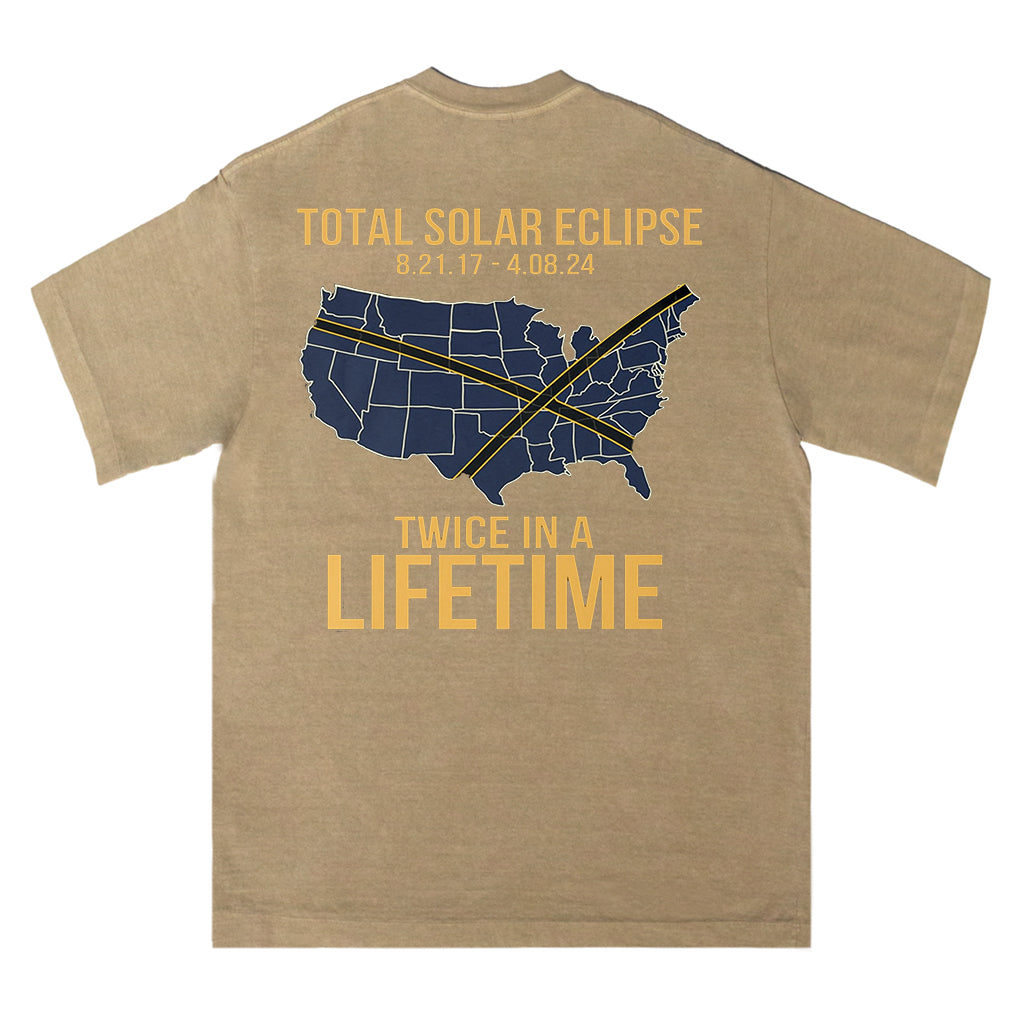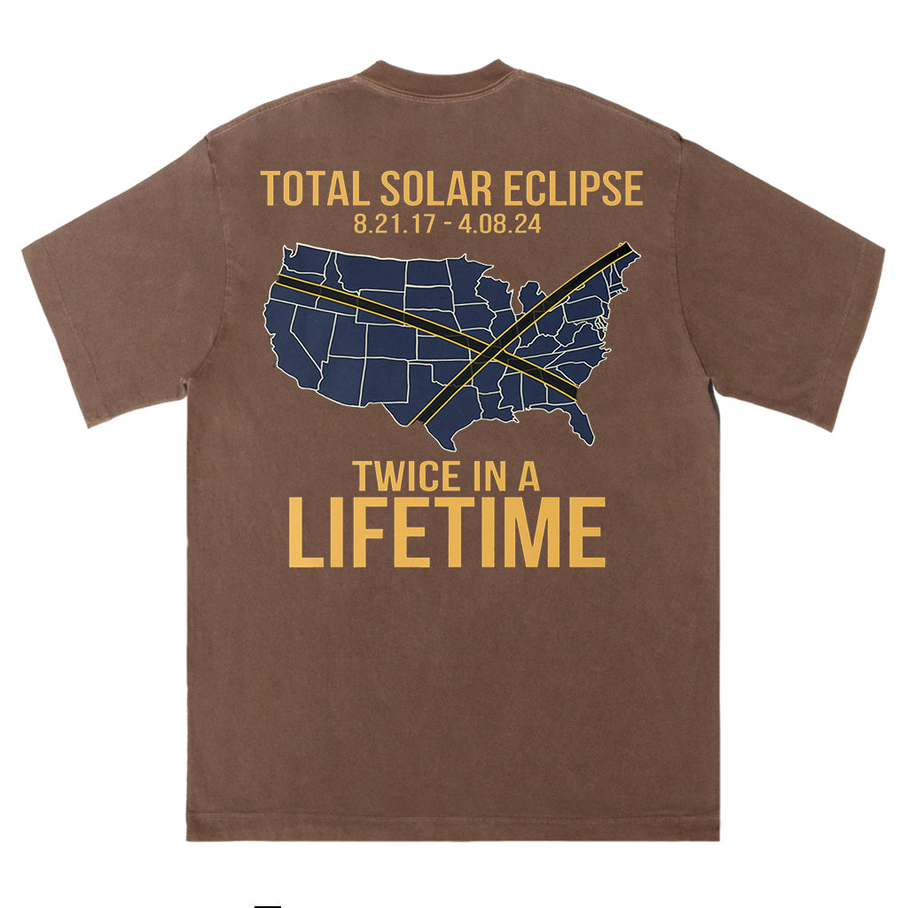 Commemorate a rare celestial event with LouMark’s Total Solar Eclipse Lifetime Tee. This washed brown shirt features a vintage-style back graphic of the United States map highlighting the paths of two solar eclipses with the dates “8.21.17 - 4.08.24,” accompanied by bold text “TOTAL SOLAR ECLIPSE TWICE IN A LIFETIME.” Made from 100% cotton for comfortable, everyday wear.
