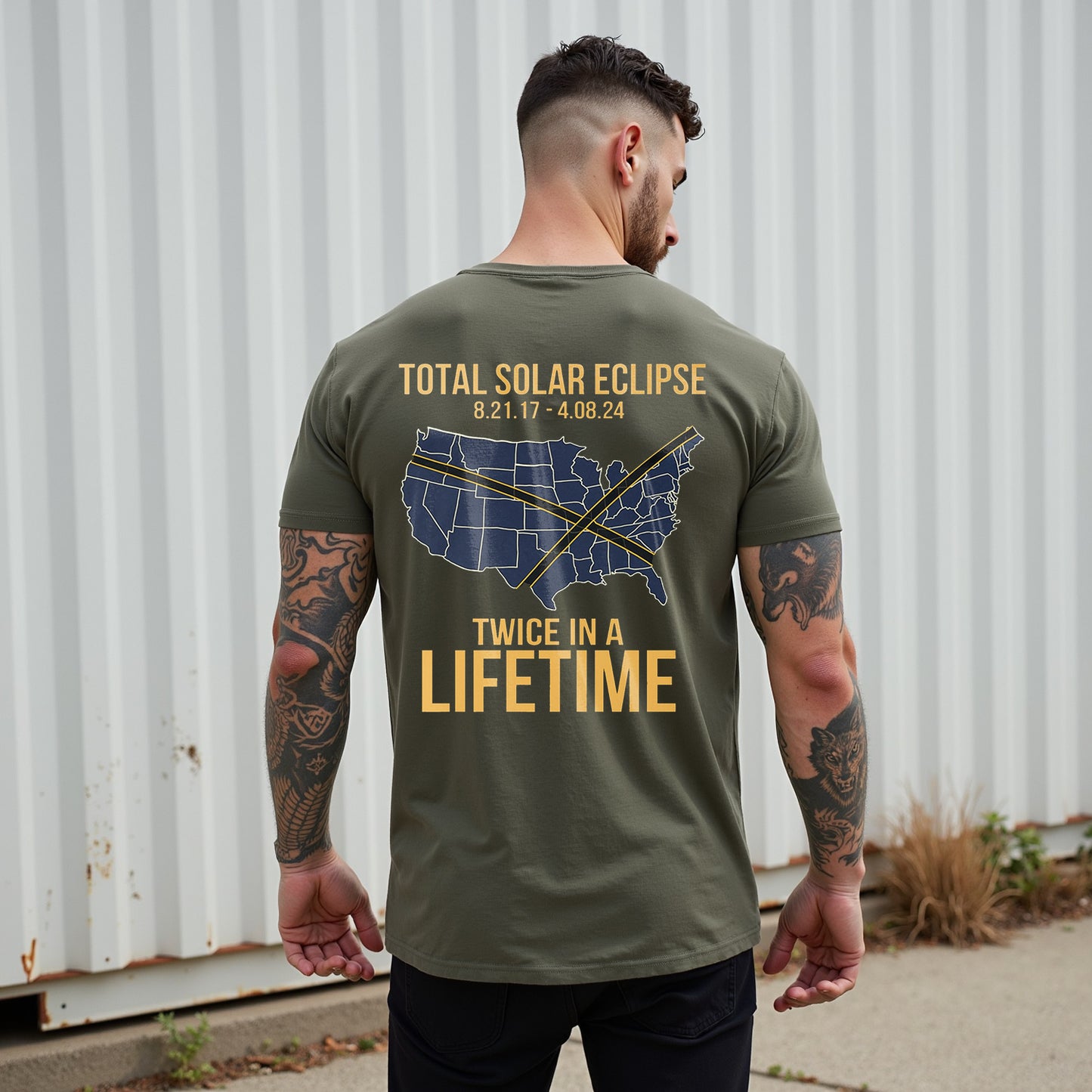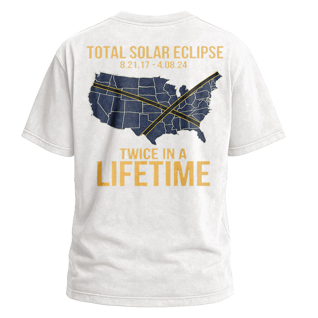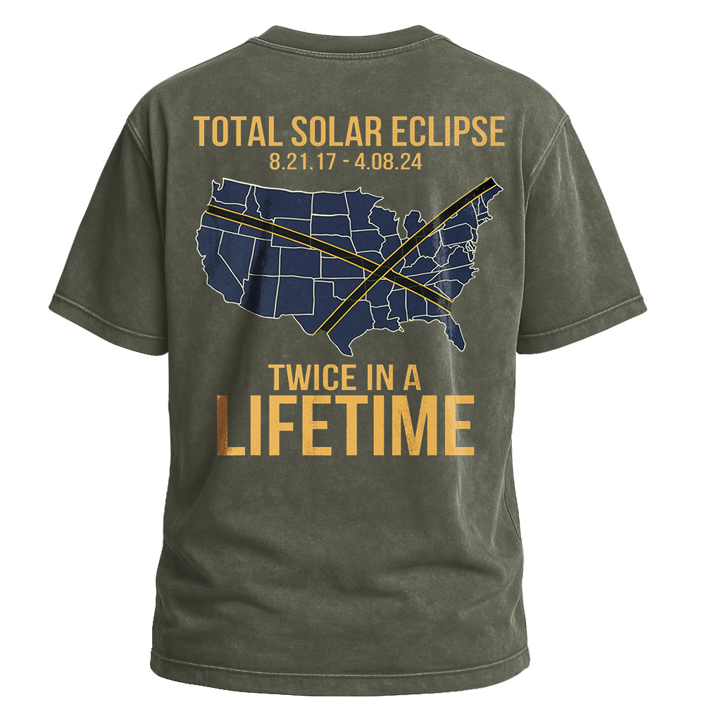 Commemorate a rare celestial event with LouMark’s Total Solar Eclipse Lifetime Tee. This washed brown shirt features a vintage-style back graphic of the United States map highlighting the paths of two solar eclipses with the dates “8.21.17 - 4.08.24,” accompanied by bold text “TOTAL SOLAR ECLIPSE TWICE IN A LIFETIME.” Made from 100% cotton for comfortable, everyday wear.