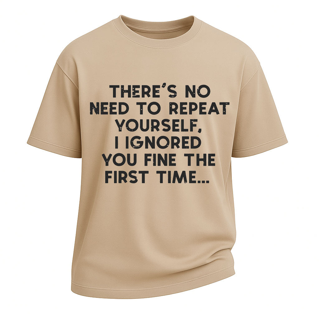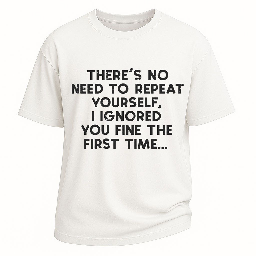 Bring sarcasm into your style with this Ignored You slogan short-sleeve t-shirt. Made from 260G 100% cotton, this heavyweight tee ensures long-lasting comfort and durability. The witty text print reads “THERE’S NO NEED TO REPEAT YOURSELF. I IGNORED YOU FINE THE FIRST TIME…,” creating a bold and humorous statement. With its standard fit and crew neckline, this tee is ideal for casual wear, parties, and streetwear looks.