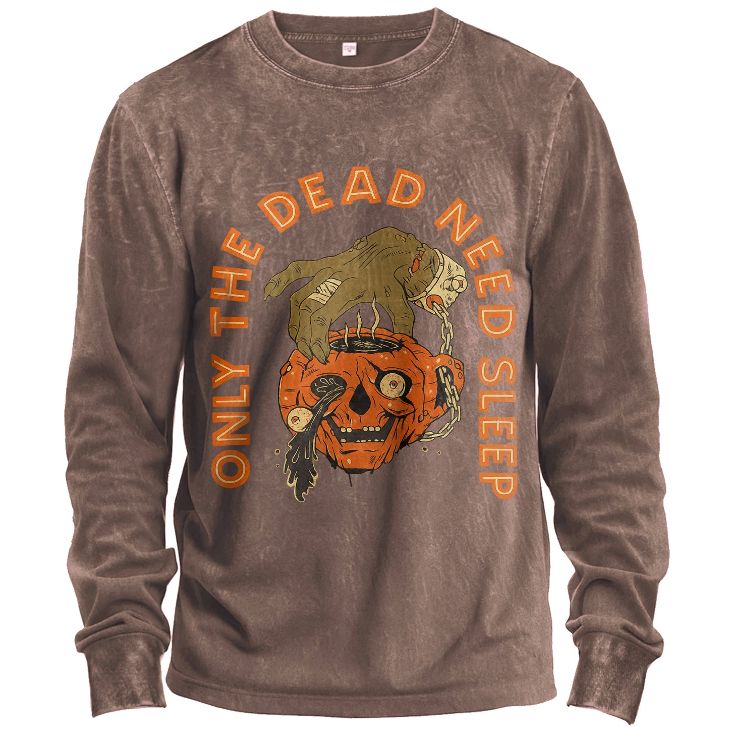 For the night owls and the never-say-die. This vintage-washed army-green long-sleeve T-shirt features a gritty Halloween graphic: a zombie hand gripping a chained jack-o’-lantern skull, framed by bold orange lettering that reads “ONLY THE DEAD NEED SLEEP.” Cut from soft 100% cotton for a broken-in feel right out of the bag.