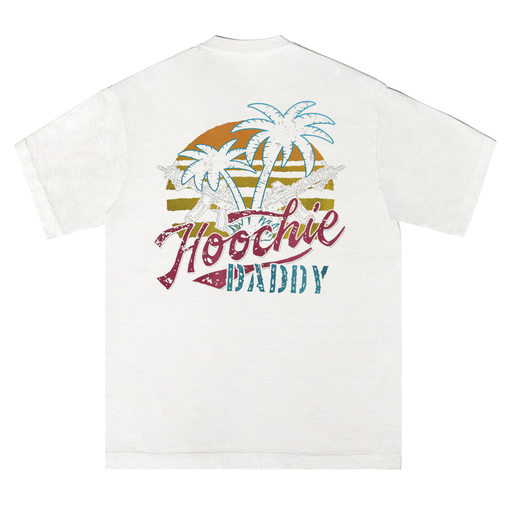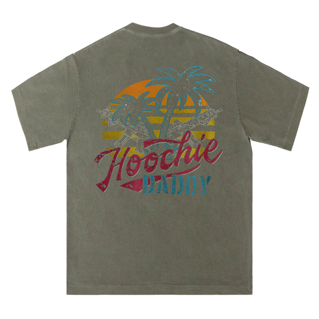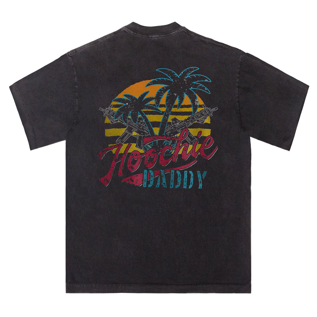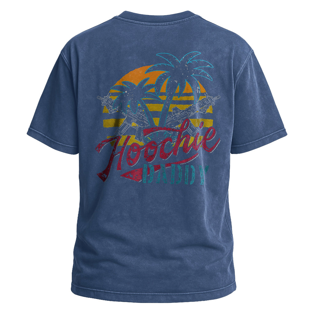 Celebrate vintage vibes with LouMark’s Hoochie Daddy Vintage Tee. This washed brown shirt features a retro-style back graphic of a sunset with palm trees, overlaid with the cursive text “Hoochie Daddy” in faded red and teal tones. Made from 100% cotton for comfortable casual wear with nostalgic style.