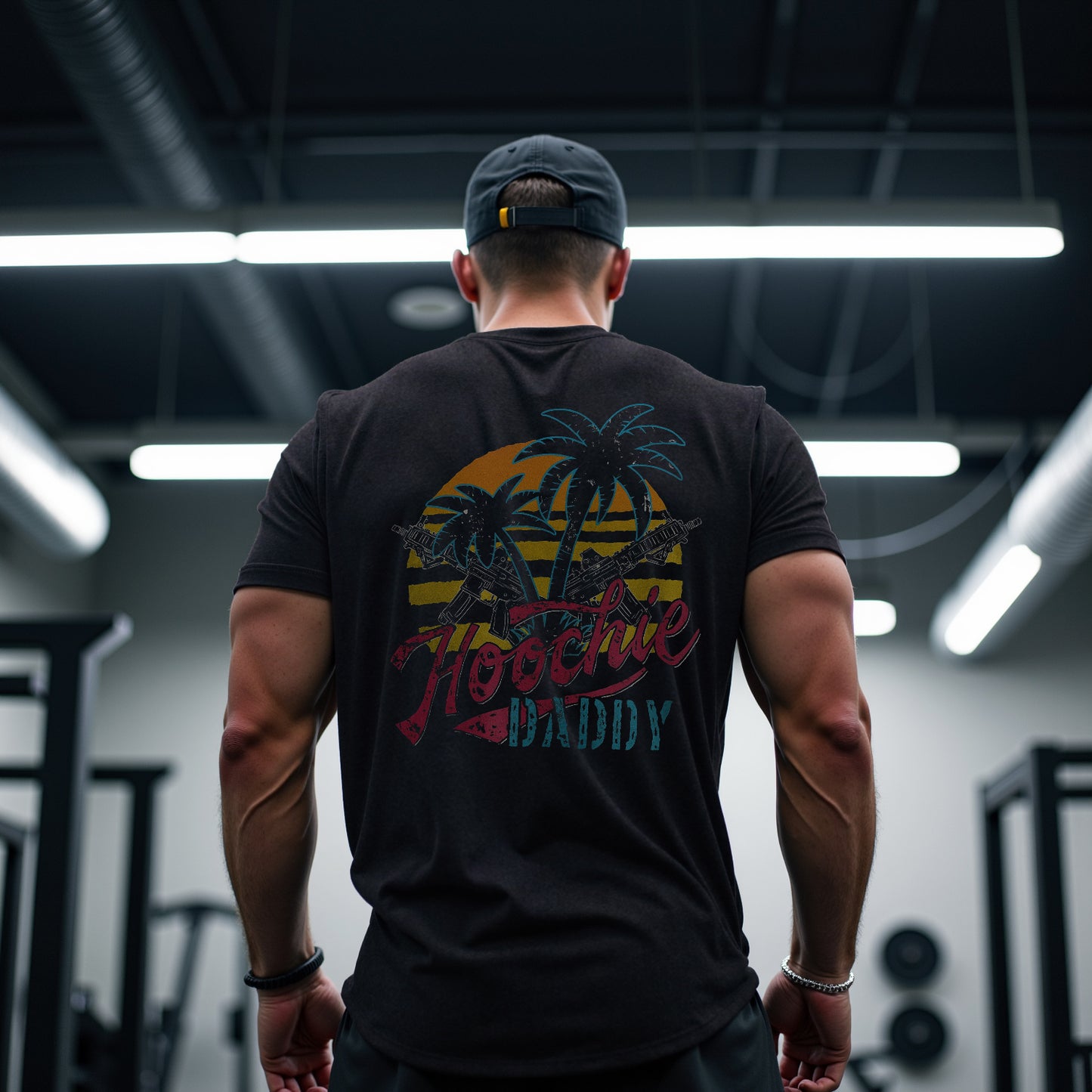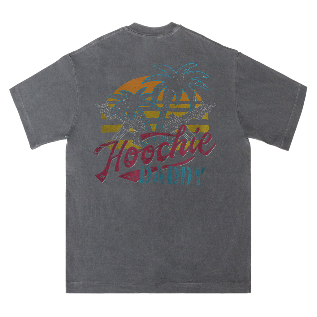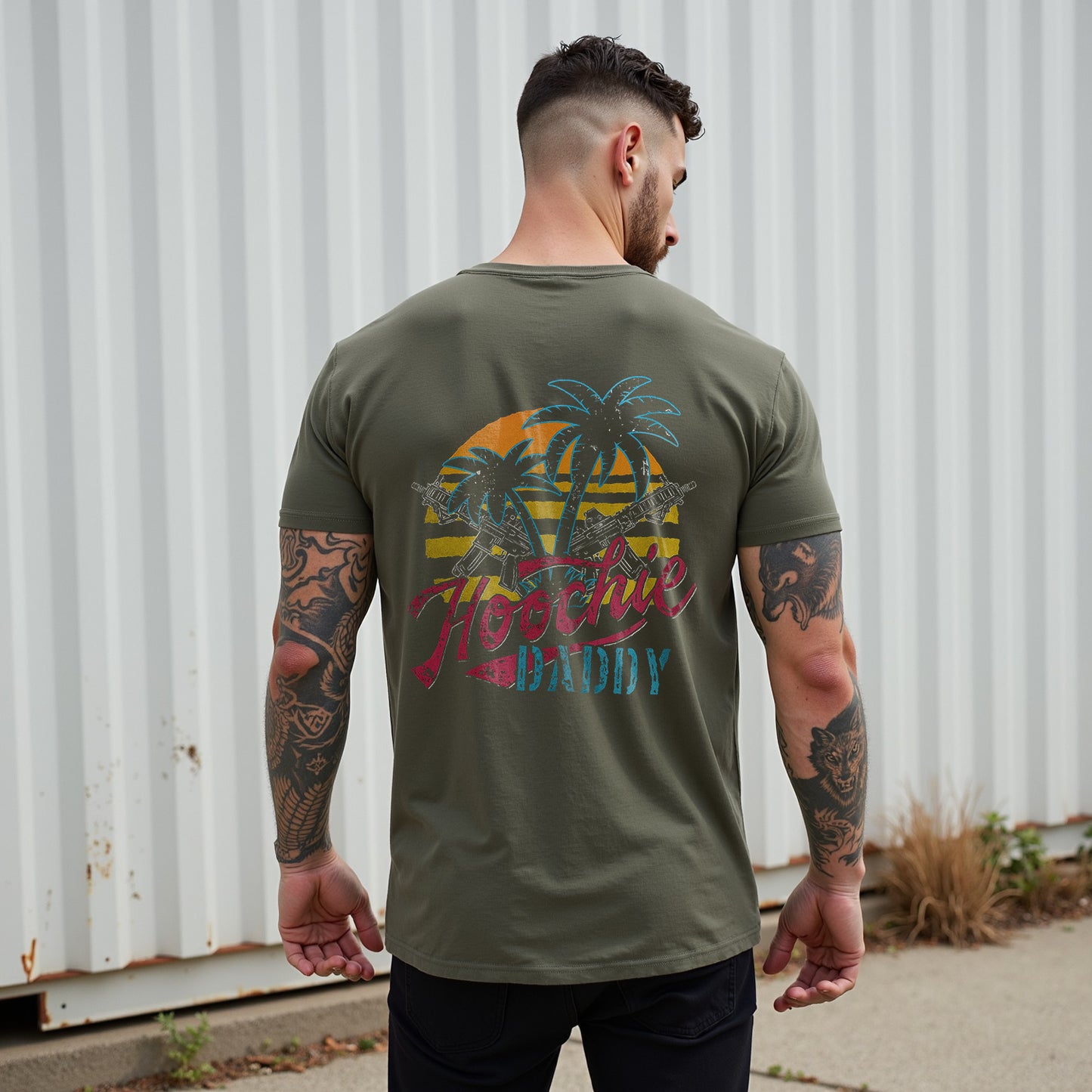 Celebrate vintage vibes with LouMark’s Hoochie Daddy Vintage Tee. This washed brown shirt features a retro-style back graphic of a sunset with palm trees, overlaid with the cursive text “Hoochie Daddy” in faded red and teal tones. Made from 100% cotton for comfortable casual wear with nostalgic style.