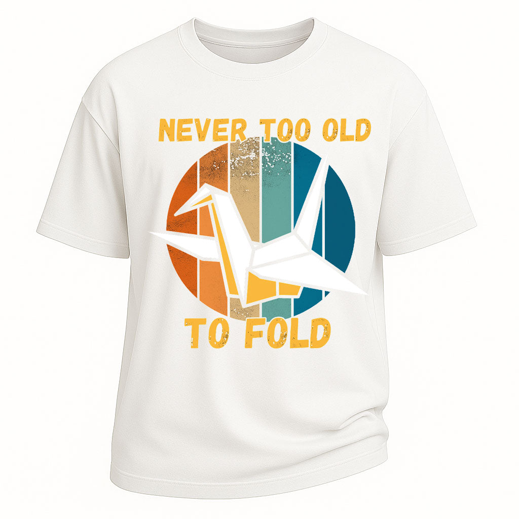 Keep humor and wisdom alive with LouMark’s Never Too Old To Fold Tee. Made from heavy 260G 100% cotton, this oversized T-shirt provides a structured fit with casual comfort. The design features a bold origami crane over a retro circular background with the phrase “NEVER TOO OLD TO FOLD.” A witty nod to age, resilience, and playful spirit.