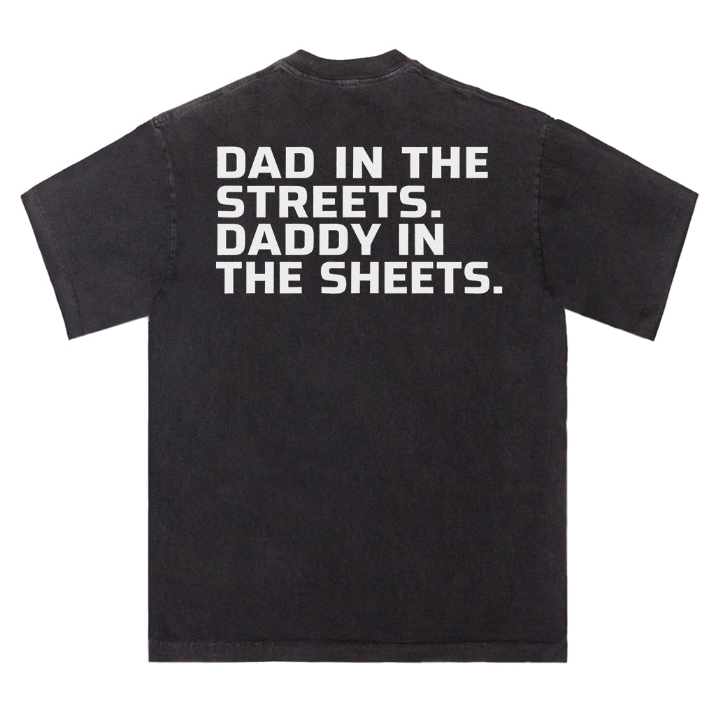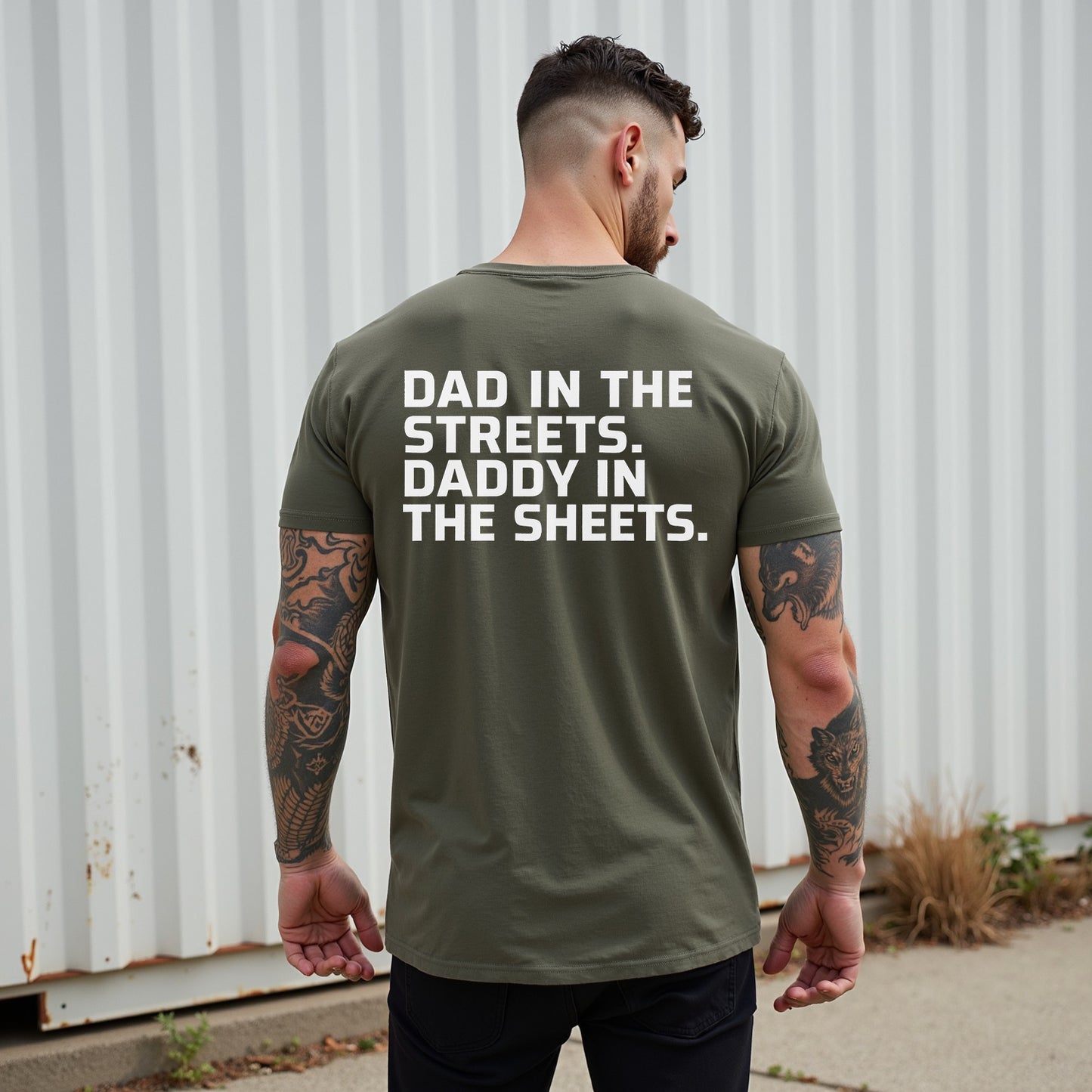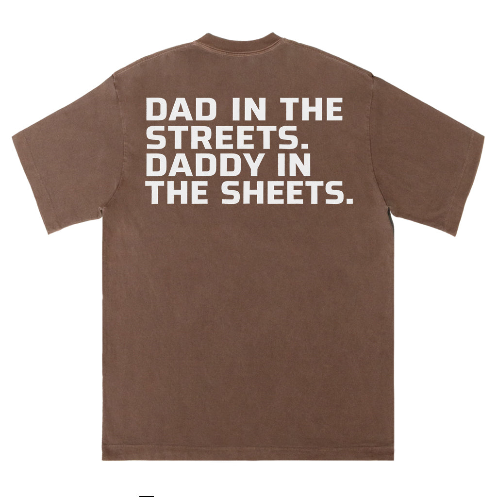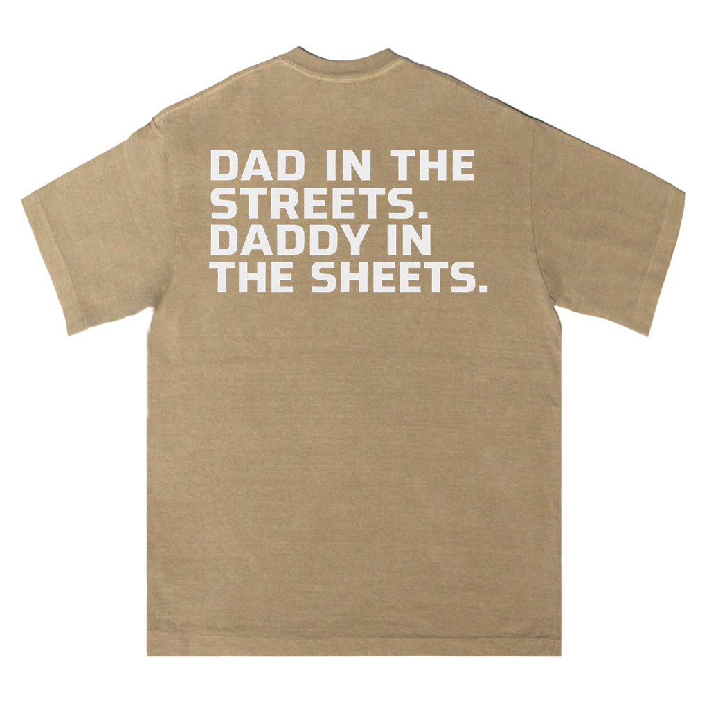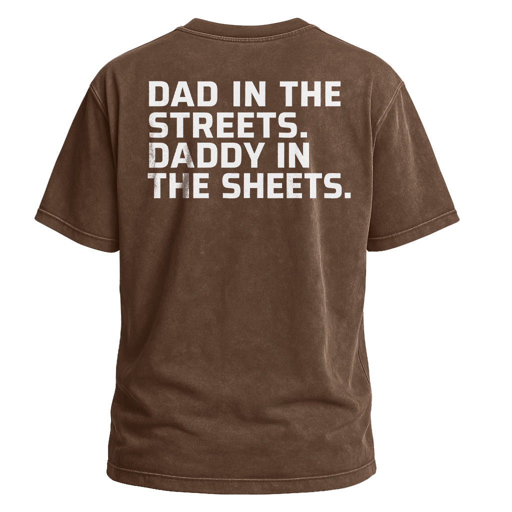 Show your playful side with LouMark’s Dad in the Streets Tee. This washed brown shirt features bold white typography on the back reading “DAD IN THE STREETS. DADDY IN THE SHEETS.” Crafted from 100% cotton for comfortable, casual wear with a cheeky attitude.