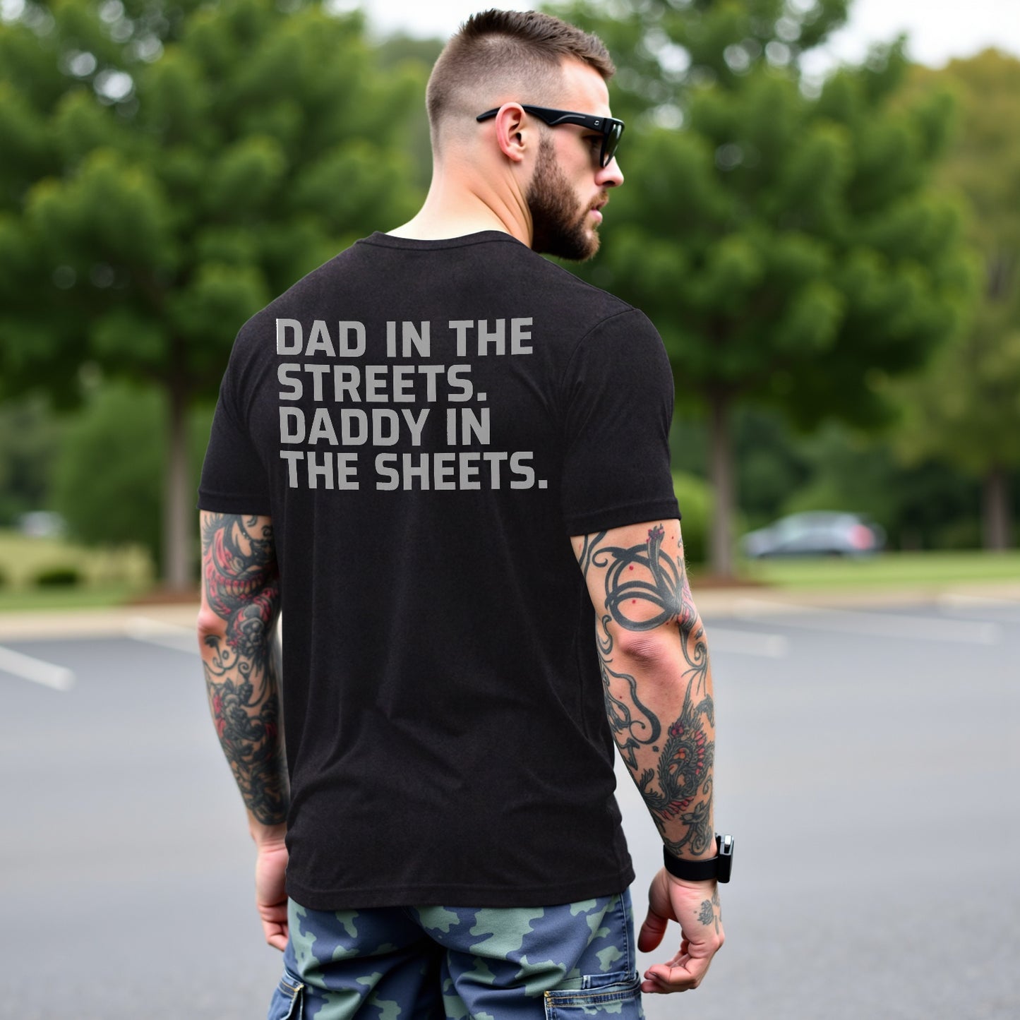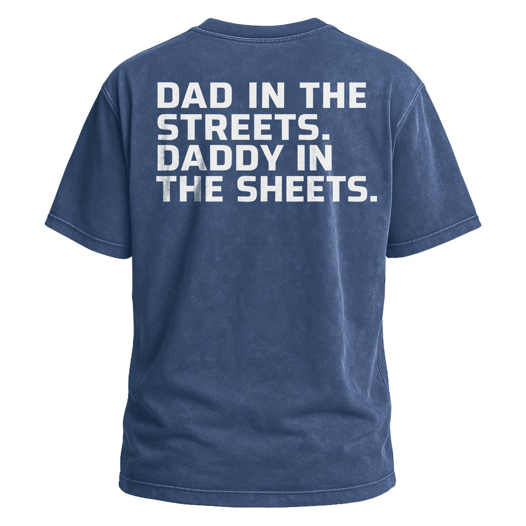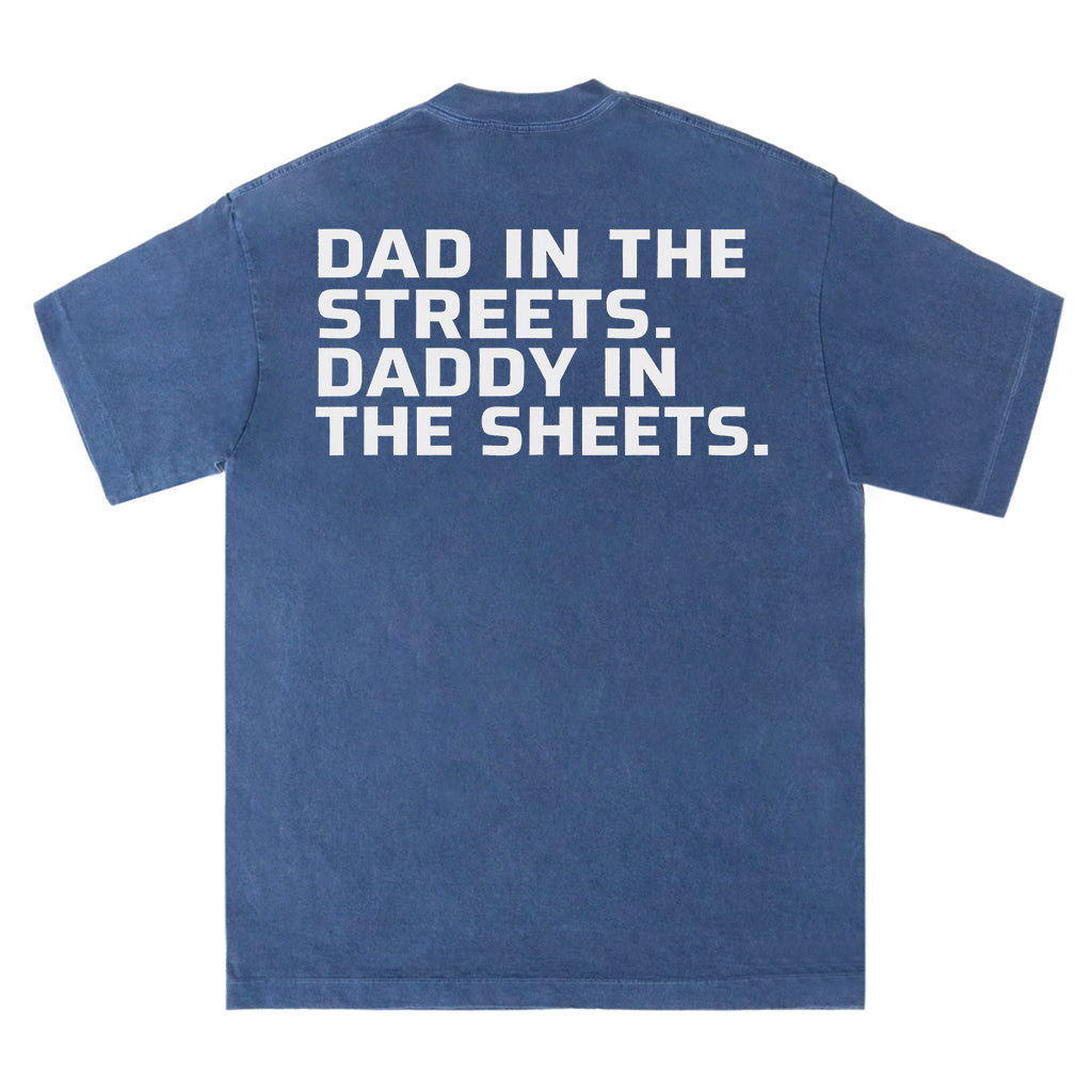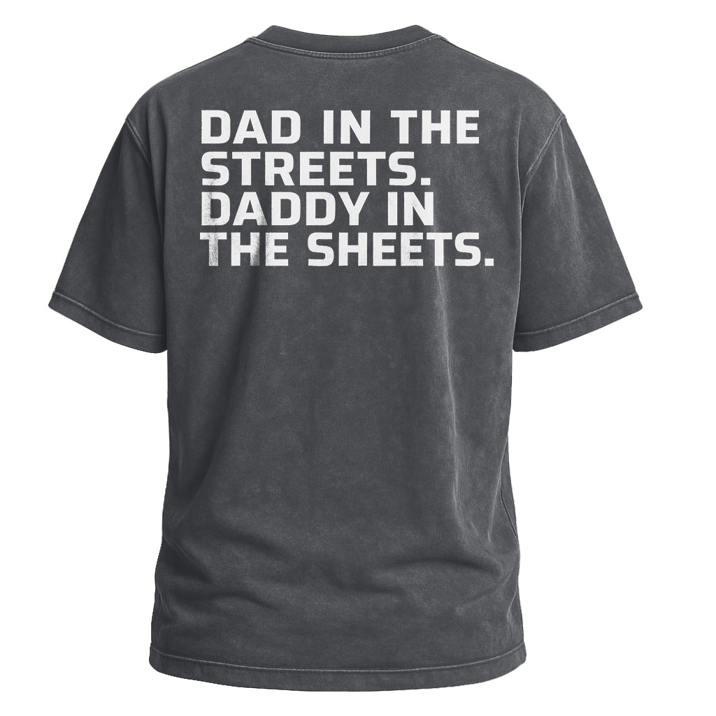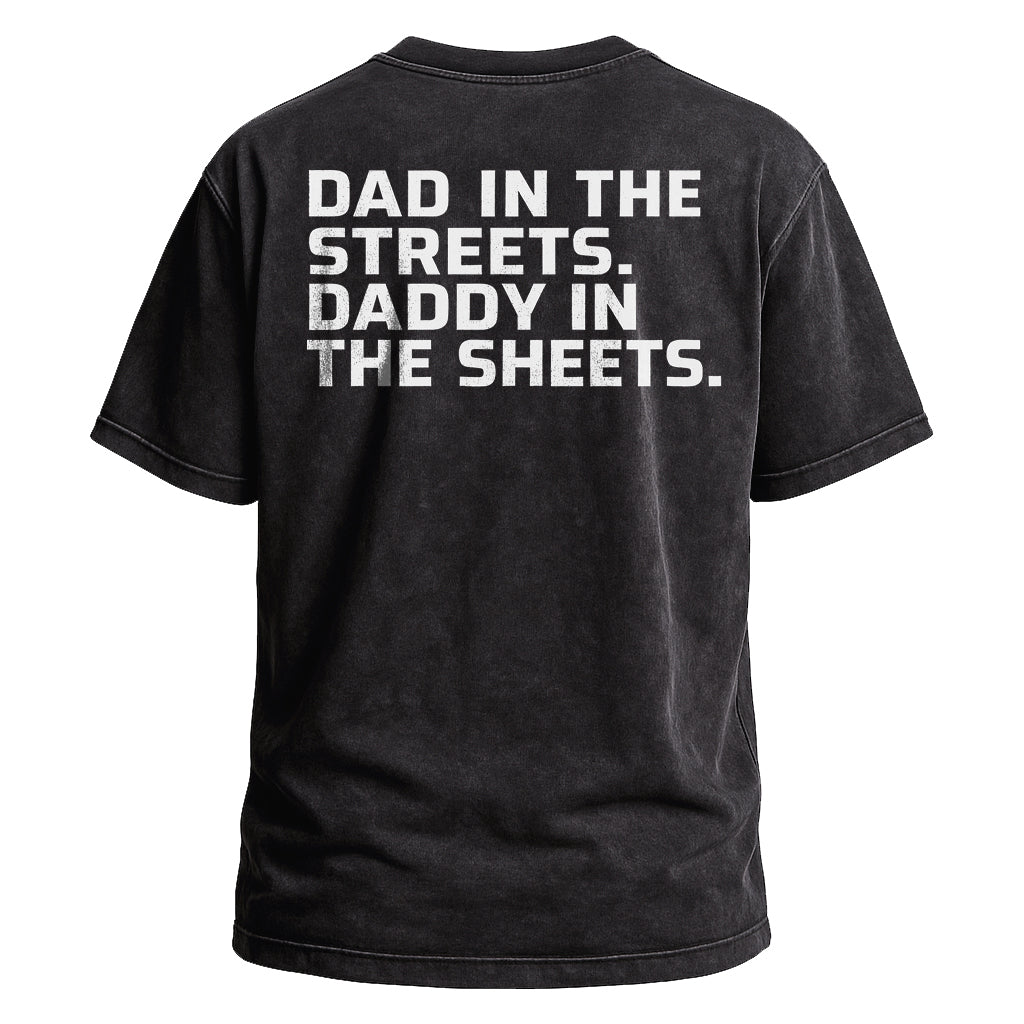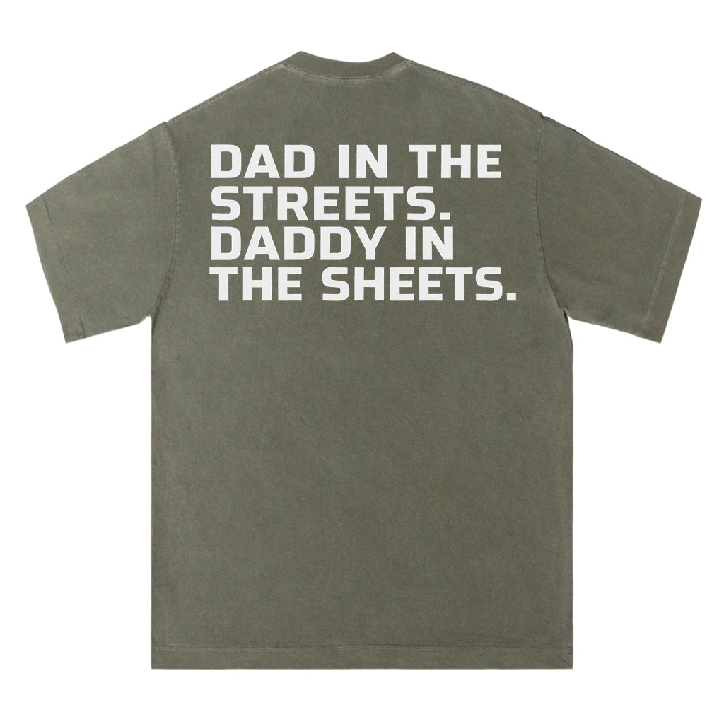Show your playful side with LouMark’s Dad in the Streets Tee. This washed brown shirt features bold white typography on the back reading “DAD IN THE STREETS. DADDY IN THE SHEETS.” Crafted from 100% cotton for comfortable, casual wear with a cheeky attitude.