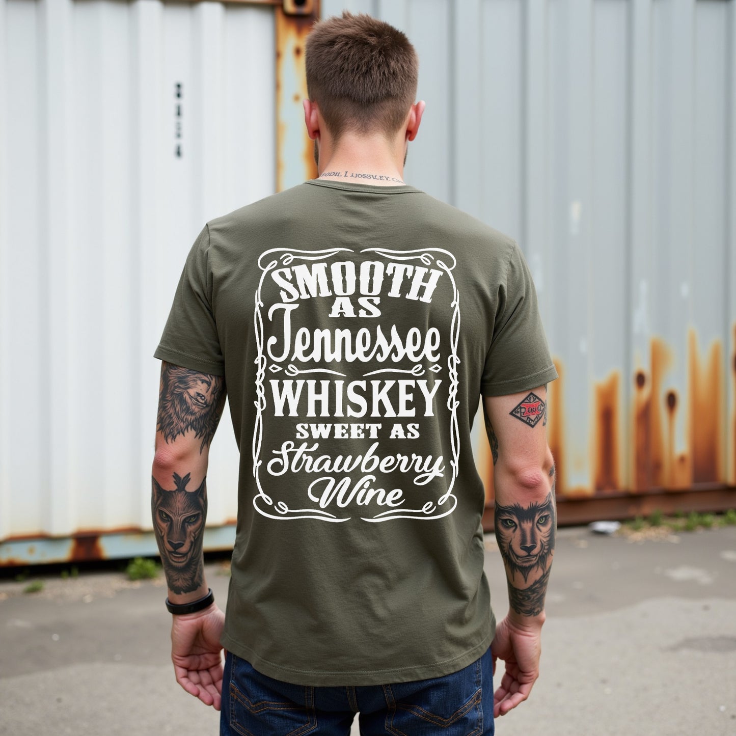 Celebrate the smooth taste of Tennessee with LouMark’s Smooth Tennessee Whiskey Tee. This washed brown shirt features a vintage-style white typography graphic with the phrase “SMOOTH AS TENNESSEE WHISKEY SWEET AS STRAWBERRY WINE,” framed by decorative elements. Made from 100% cotton for comfortable, casual wear.