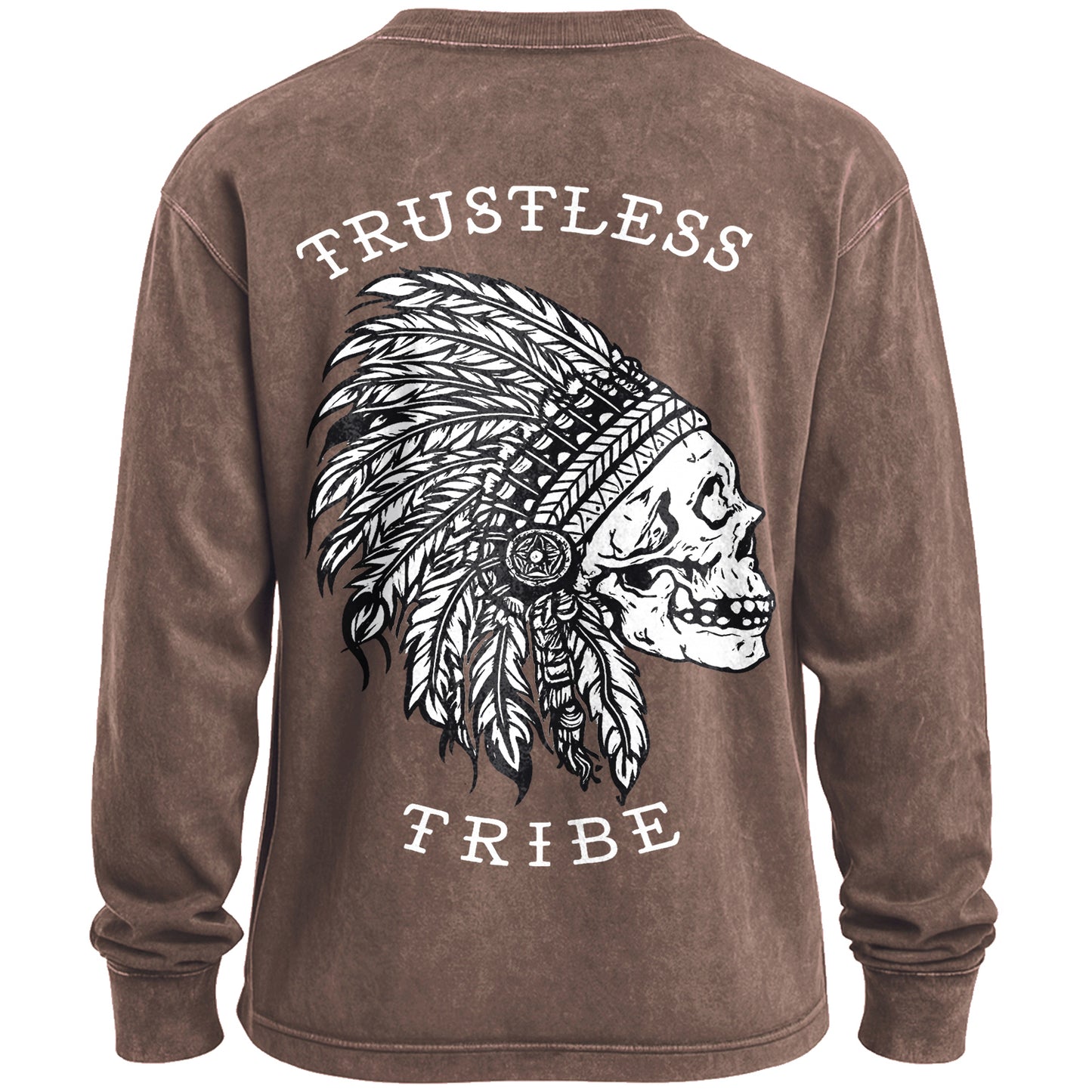 Ride-your-own-way energy. This vintage-washed grey long-sleeve T-shirt features a bold back graphic: a white line-art skull in a feather headdress with arched text reading “TRUSTLESS TRIBE.” Front is clean for an easy, everyday wear. Cut from soft 100% cotton with a broken-in feel out of the bag.