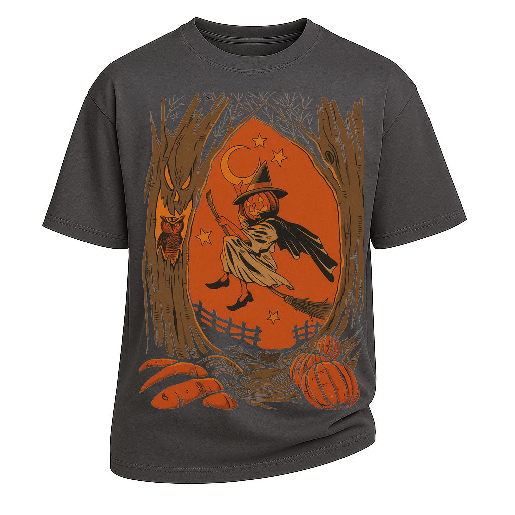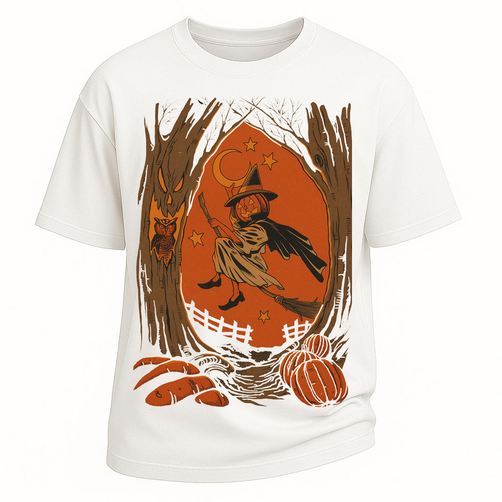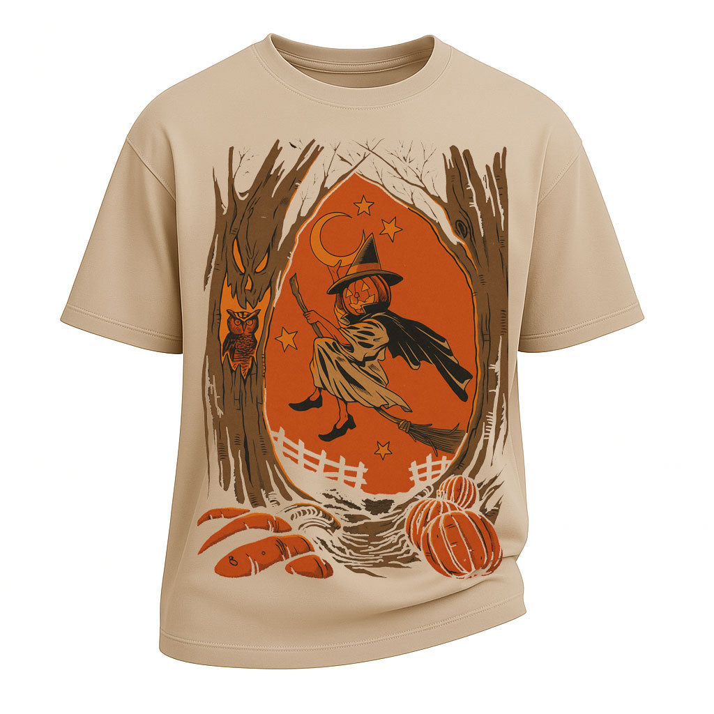 Step into the spirit of Halloween with LouMark’s "Witch Pumpkin Patch" oversized tee. Crafted from 260G heavyweight 100% cotton, this shirt offers durability, comfort, and a premium oversized silhouette. The front showcases a vintage-inspired illustration of a witch flying past a crescent moon, framed by autumn trees, pumpkins, and rustic fall elements. Designed for those who love Halloween charm with a touch of retro artistry, it’s the perfect seasonal statement piece.