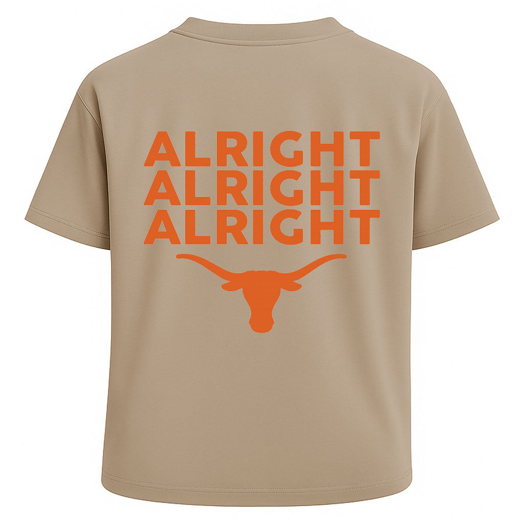 Zeigen Sie Ihren texanischen Stolz und Ihren lässigen Stil mit dem „Alright Alright Alright“-T-Shirt von LouMark. Das schwarze Oversize-T-Shirt aus robustem 260g-Baumwollgewebe vereint Langlebigkeit mit einem entspannten Streetwear-Schnitt. Die Vorderseite besticht durch das minimalistische LouMark-Longhorn-Logo, während die Rückseite mit dem markanten orangefarbenen Schriftzug „ALRIGHT ALRIGHT ALRIGHT“ über der Silhouette eines Longhorns beeindruckt. Eine zeitlose Hommage an das Selbstbewusstsein des Südens und die Tradition des Westens.