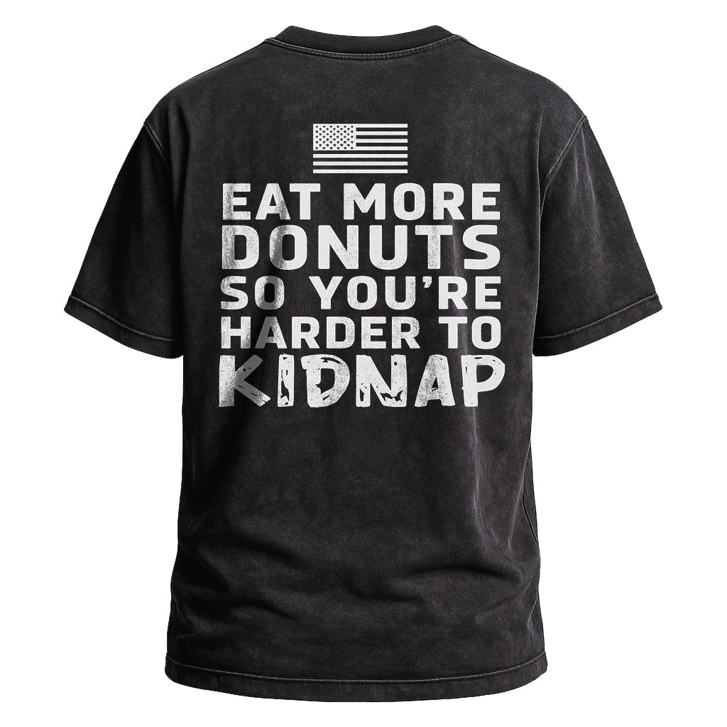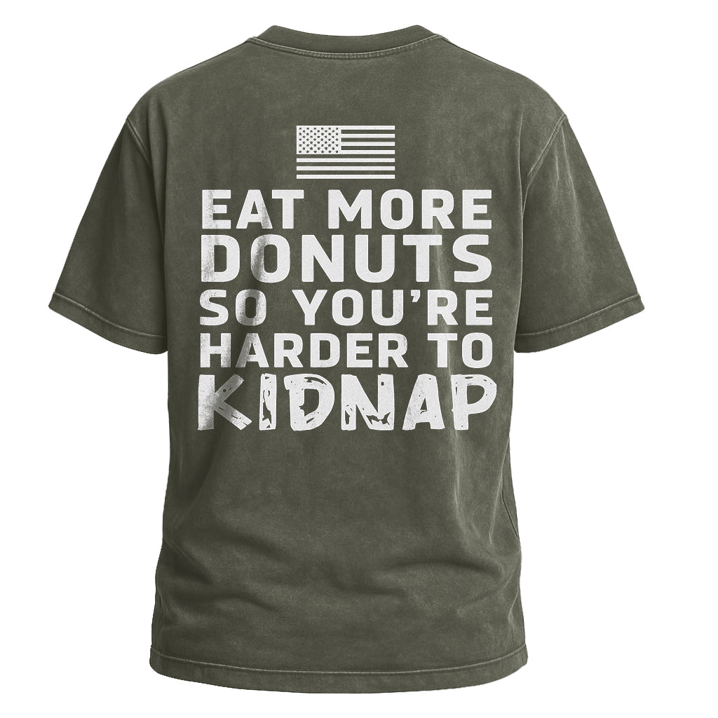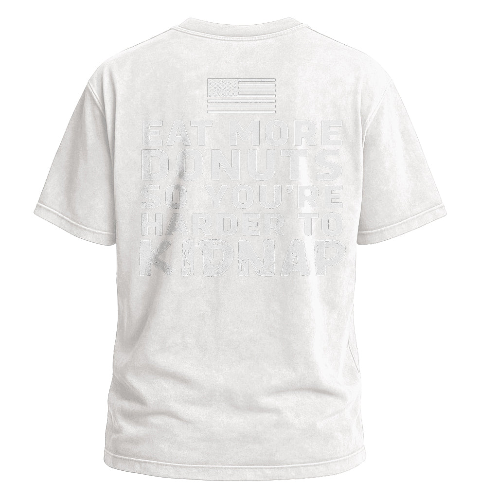 Setzen Sie ein verspieltes Statement mit LouMarks Eat More Donuts T-Shirt. Dieses verwaschene braune Shirt ziert auf der Rückseite die fettgedruckte weiße Schrift „EAT MORE DONUTS SO YOU'RE HARDER TO KIDNAP“, begleitet von einer kleinen amerikanischen Flagge. Hergestellt aus 100 % Baumwolle für bequeme Freizeitkleidung mit frechem Touch.