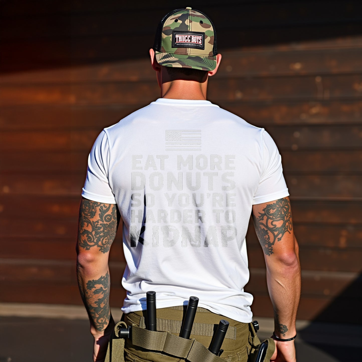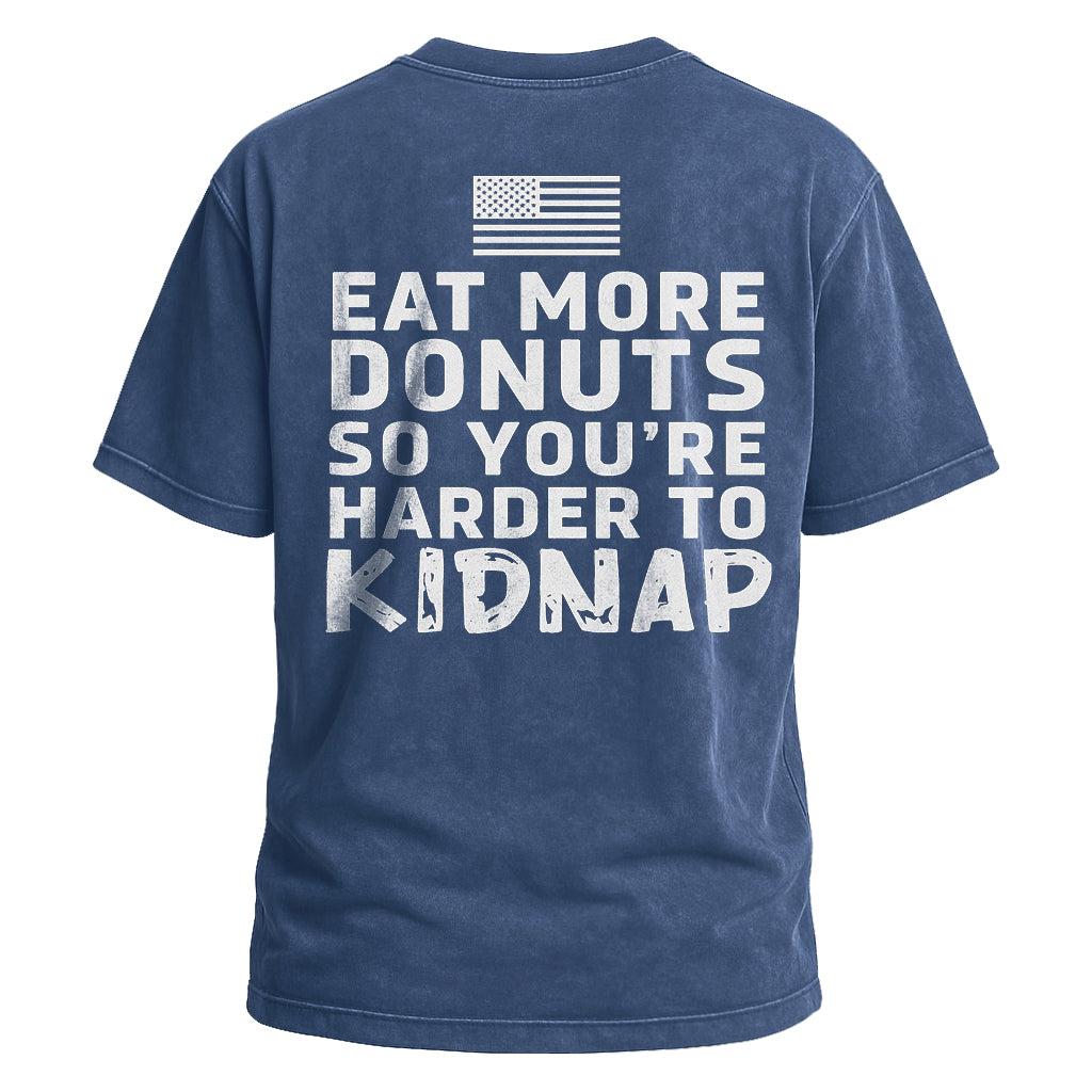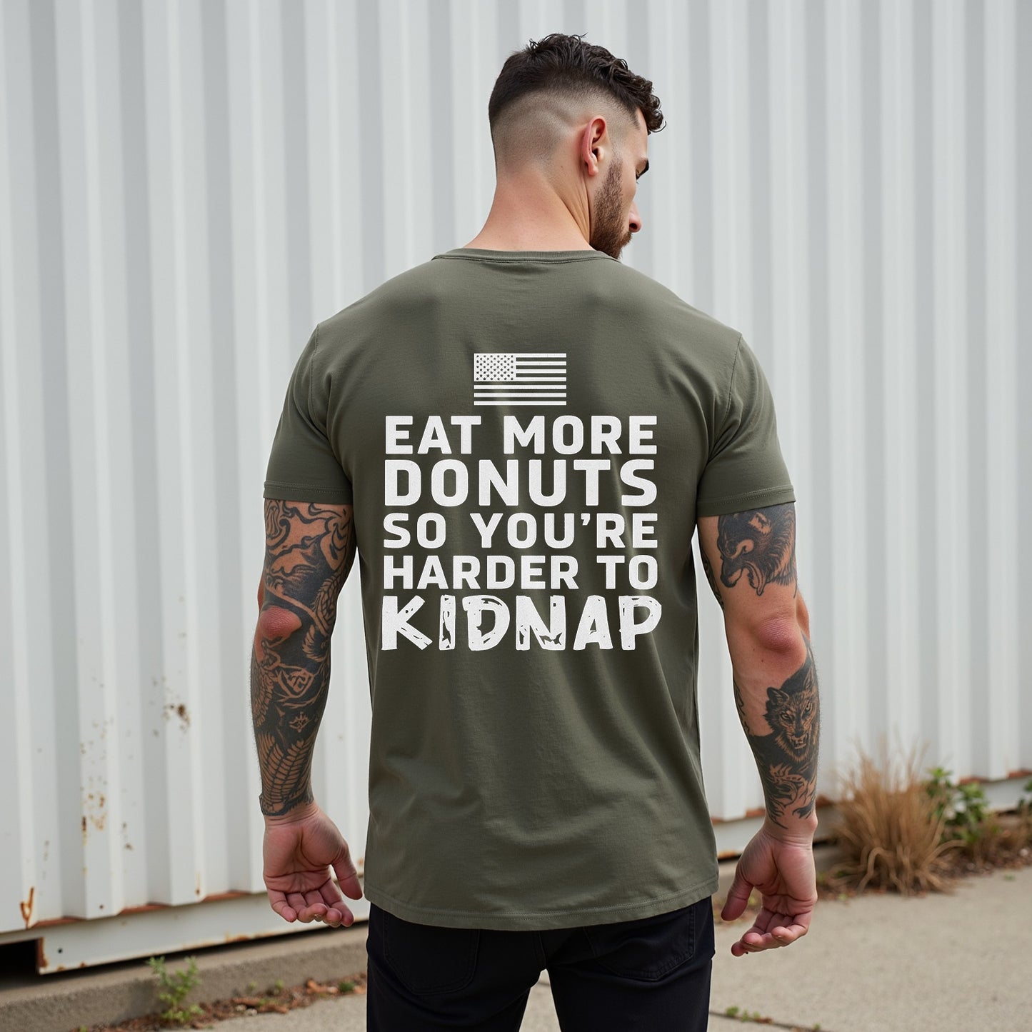 Setzen Sie ein verspieltes Statement mit LouMarks Eat More Donuts T-Shirt. Dieses verwaschene braune Shirt ziert auf der Rückseite die fettgedruckte weiße Schrift „EAT MORE DONUTS SO YOU'RE HARDER TO KIDNAP“, begleitet von einer kleinen amerikanischen Flagge. Hergestellt aus 100 % Baumwolle für bequeme Freizeitkleidung mit frechem Touch.