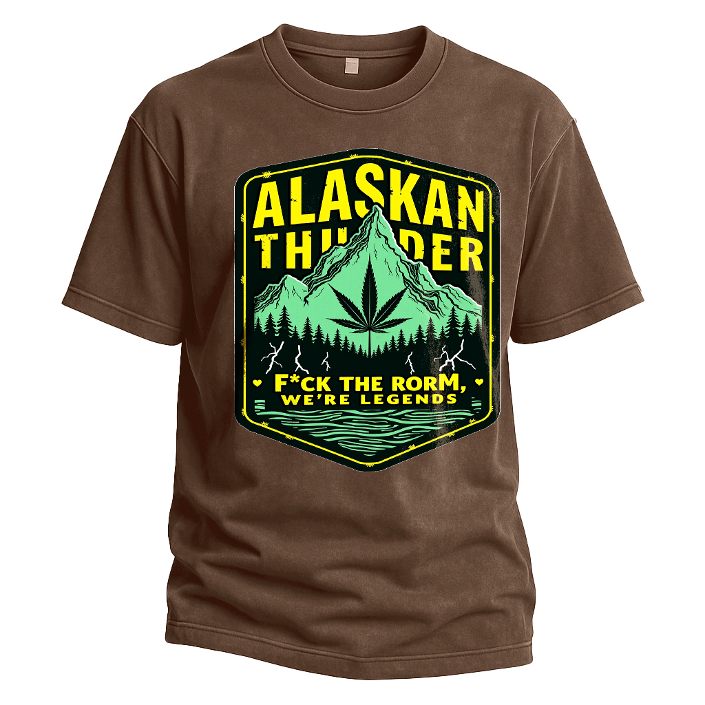 When the wild howls and the skies crack open, legends rise. This “Alaskan Thunder” tee isn’t just a shirt — it’s a declaration. With a bold weed-leaf mountain graphic and the rebellious line “F*ck the storm, we’re legends,” this design honors those who live loud, ride the high, and never blend in. Whether you're lighting one under the stars or blazing trails through life, this one’s for you.