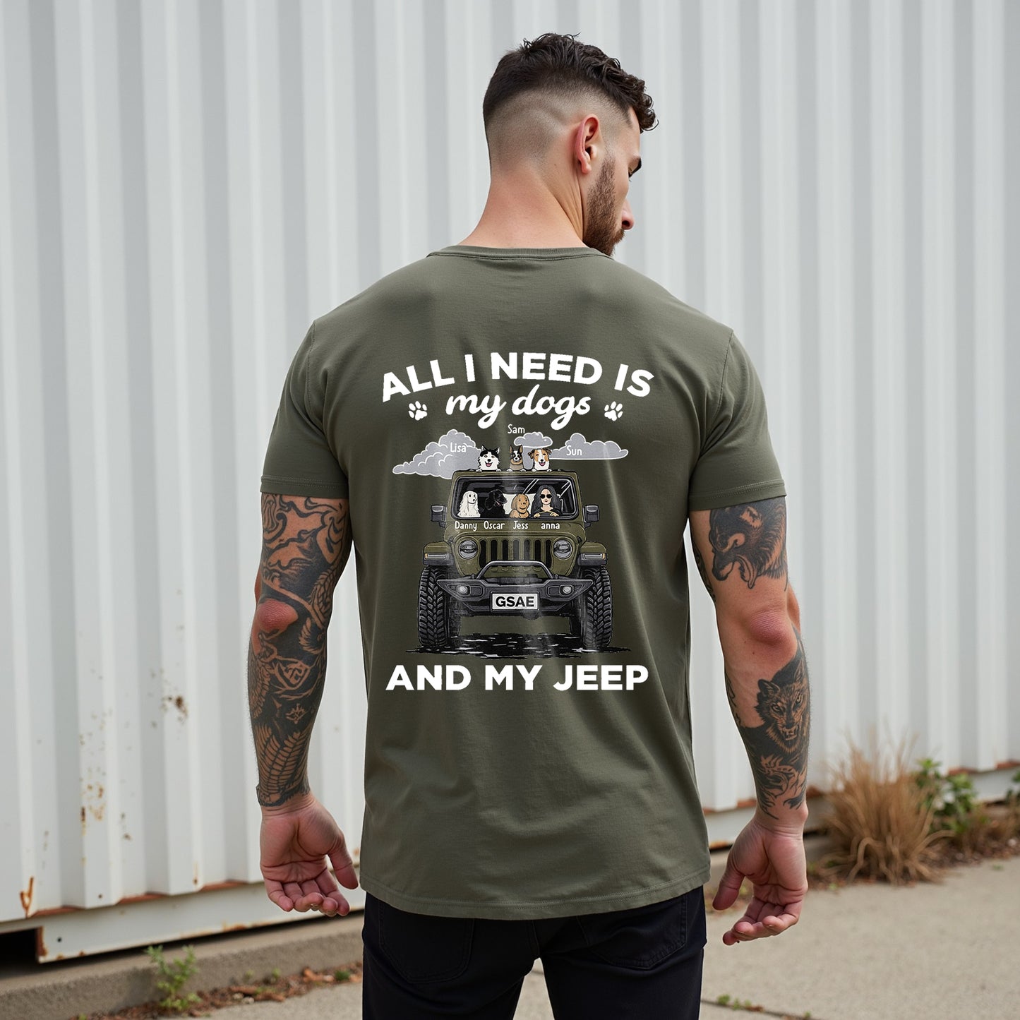 Show your love for adventure and companionship with LouMark’s All I Need Is My Dogs and My Jeep Tee. This washed brown shirt features a vintage-style back graphic of a Jeep filled with dogs, accompanied by the bold text “ALL I NEED IS my dogs AND MY JEEP.” Made from 100% cotton for comfortable, casual wear with a rugged outdoor vibe.