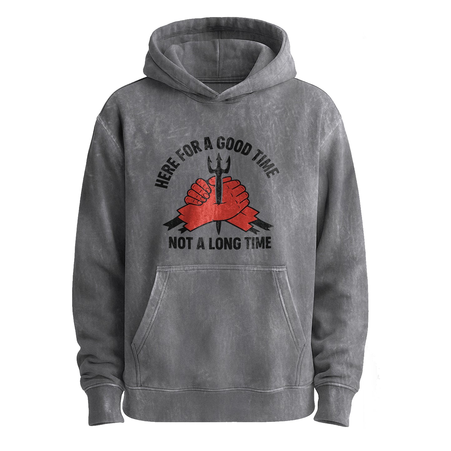 Make every moment count. This vintage-washed army-green hoodie features a bold clasped-hands-and-dagger crest with the motto “Here for a Good Time, Not a Long Time.” Built from beefy 350g 100% cotton for a soft, broken-in feel right out of the bag.
