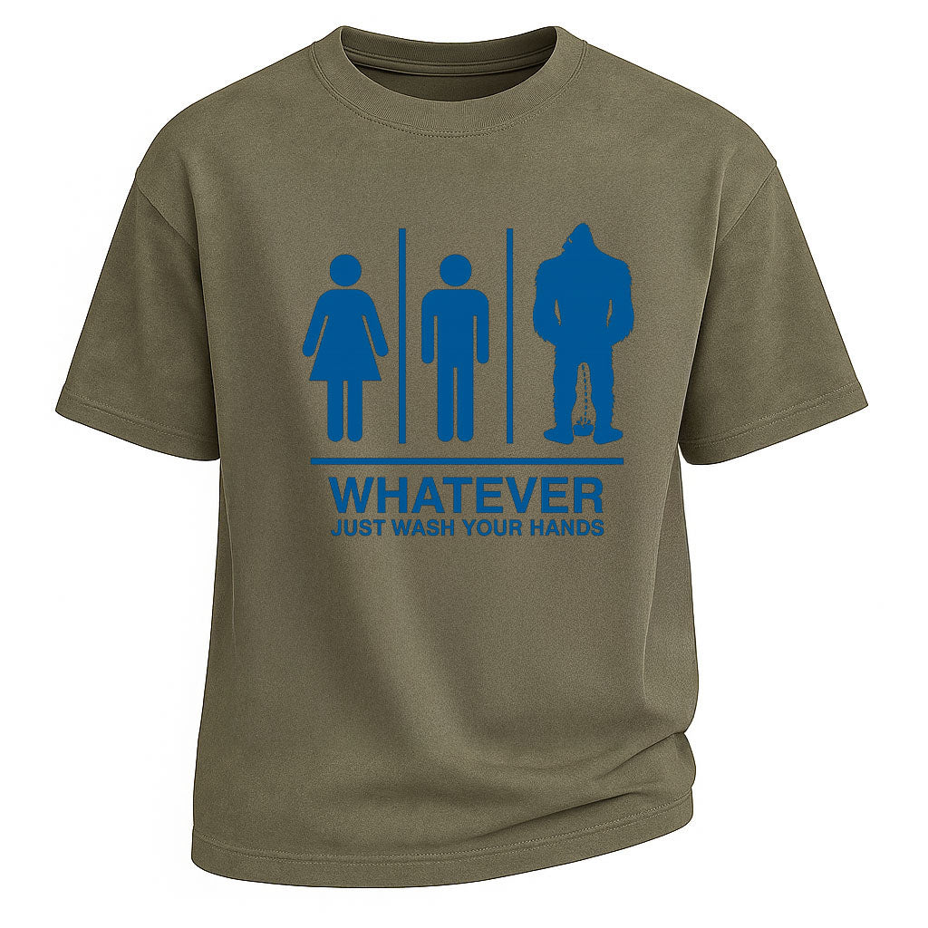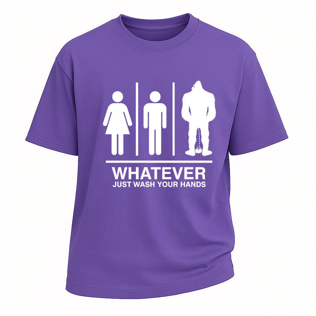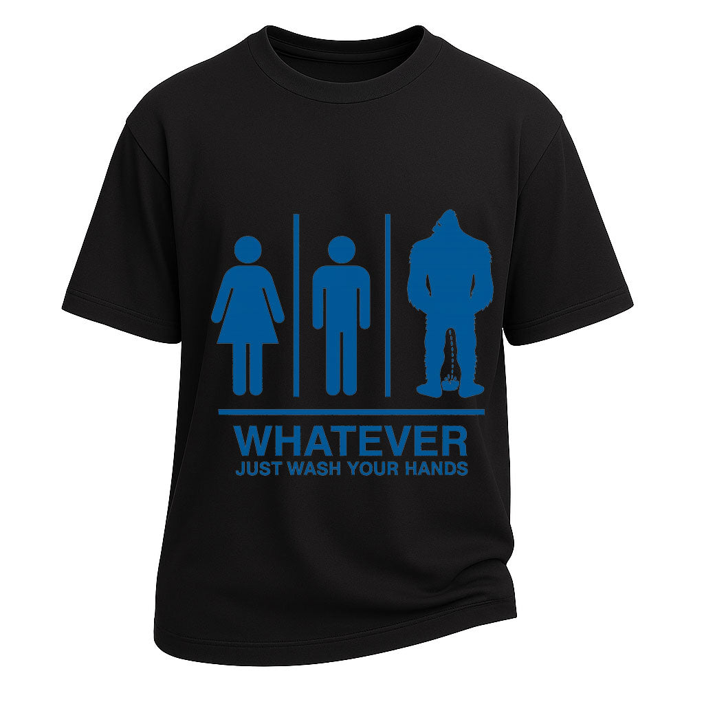 This LouMark tee serves up restroom humor with a side of truth—no matter who you are, just wash your hands. Featuring iconic silhouettes of male, female, and mythical Bigfoot, it's a cheeky yet responsible take on hygiene and identity. Perfect for office jokers, introverts, or Bigfoot believers. Made of 100% cotton for everyday comfort.