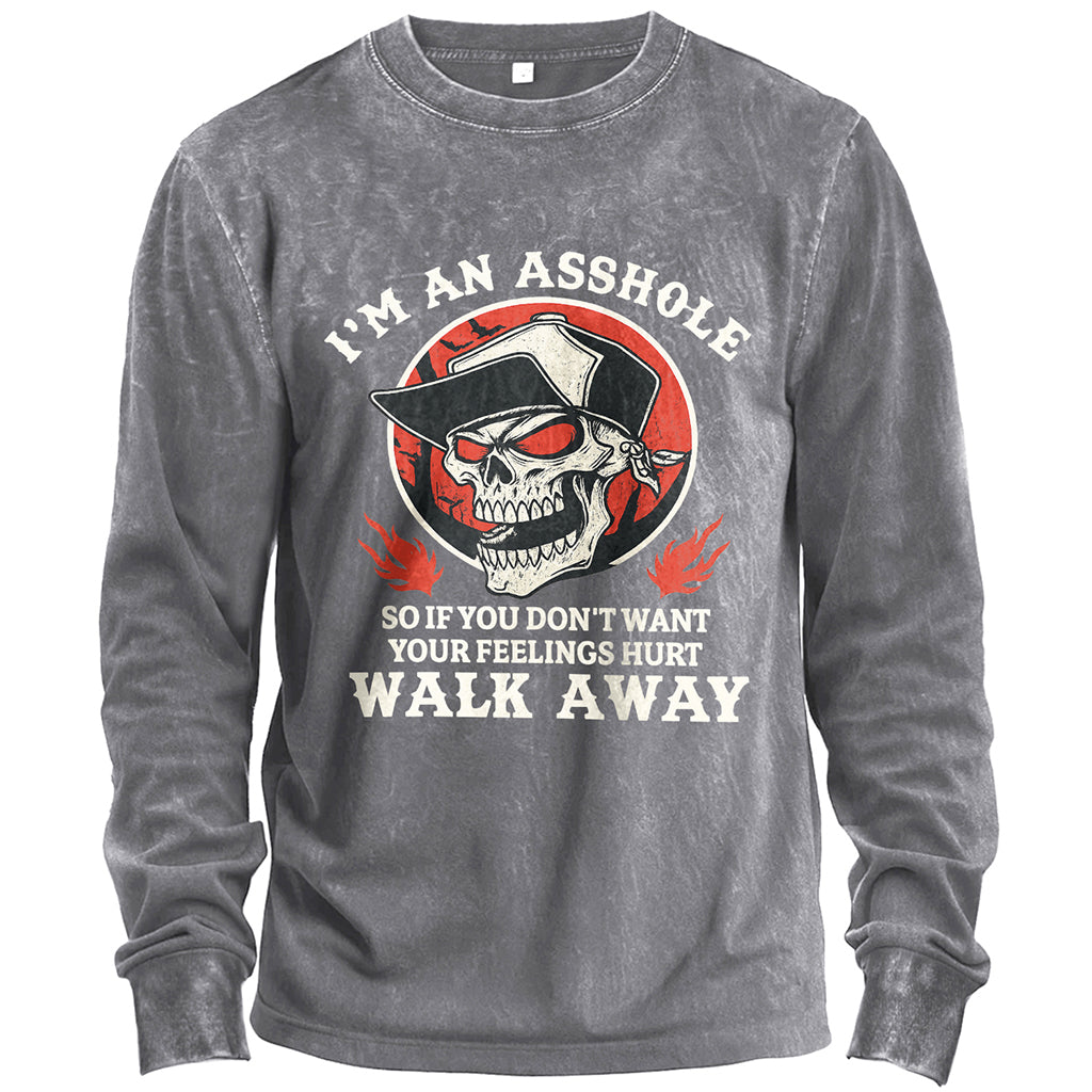 Channel unapologetic attitude with LouMark’s Asshole Skull long-sleeve t-shirt. Made from 230G 100% cotton, this shirt delivers heavy-duty comfort and durability. The standard fit design keeps it versatile for layering or solo wear. The bold front graphic features a skull in shades and cap with the statement: “I’m an Asshole — So If You Don’t Want Your Feelings Hurt, Walk Away,” making it the ultimate rebellious streetwear piece. Ribbed cuffs and a crew neckline lock in the classic silhouette while the distressed finish adds vintage grit.