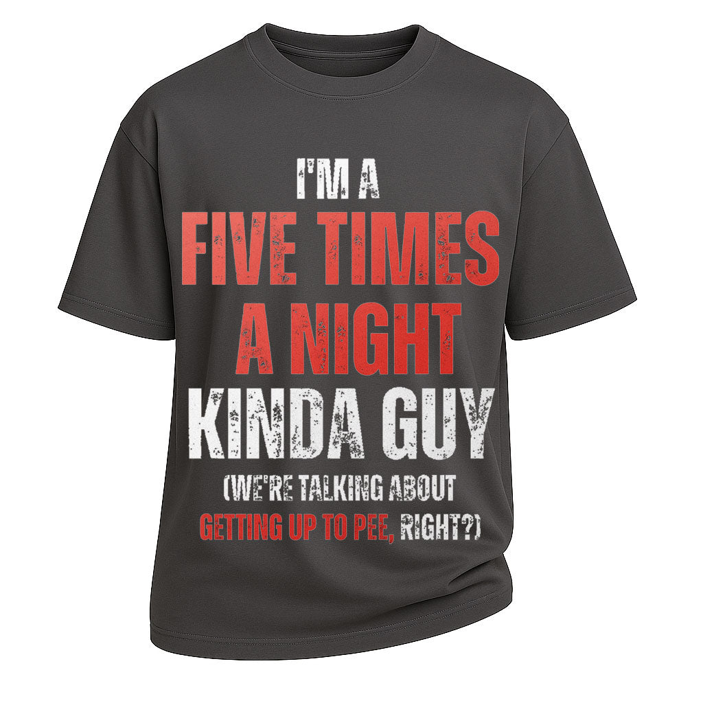 Turn age into laughter with LouMark’s Five Times a Night Humor Tee. Built from premium 260G 100% cotton, this oversized T-shirt offers lasting comfort and durability. The cheeky front print declares “I’M A FIVE TIMES A NIGHT KINDA GUY (We’re talking about getting up to pee, right?!),” blending bold humor with playful honesty. A perfect gift for dads, grandpas, or anyone who embraces getting older with a smile.