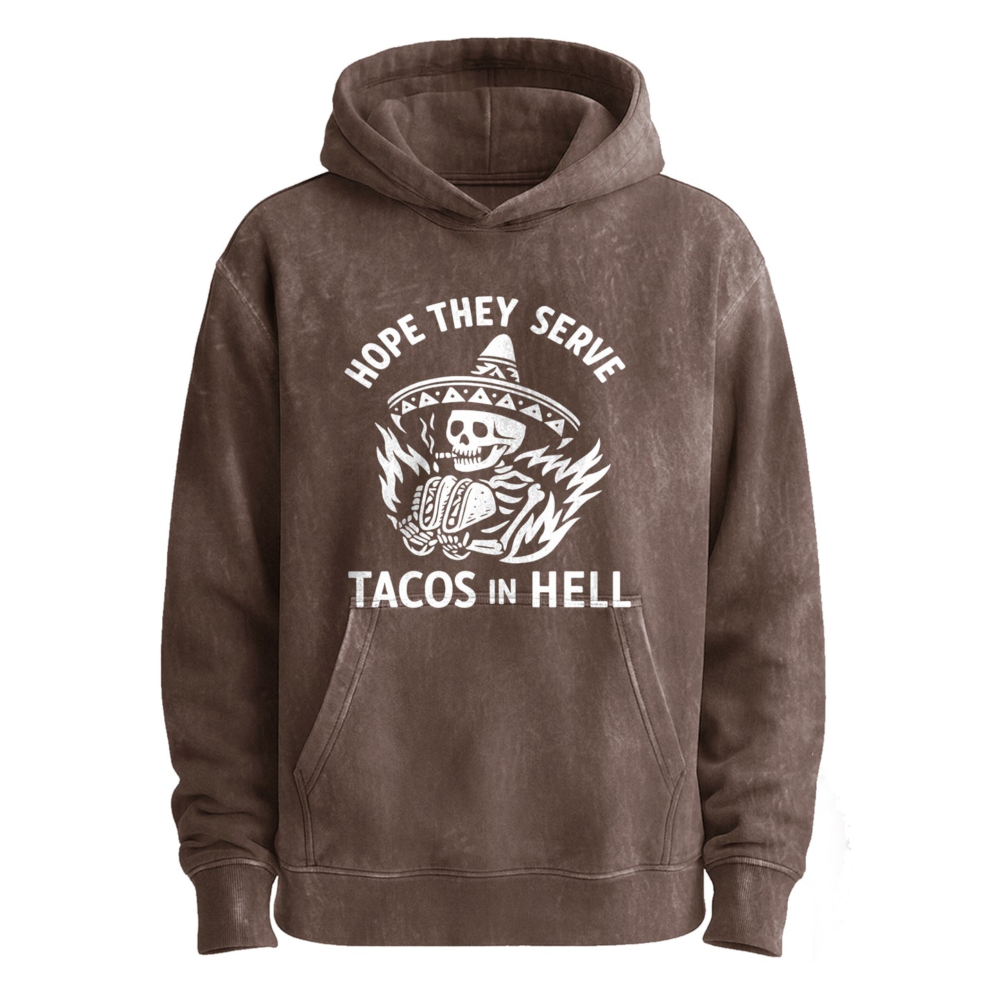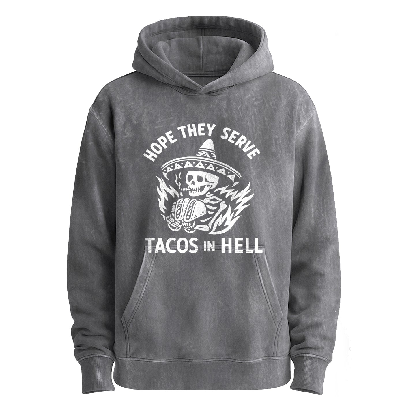For taco diehards who keep it spicy. This vintage-washed army-green hoodie features a bold white graphic of a skeleton in a sombrero clutching tacos, ringed by flames and the line “Hope They Serve Tacos in Hell.” Cut from beefy 350g (≈350 gsm) 100% cotton for a soft, broken-in feel right out of the bag.