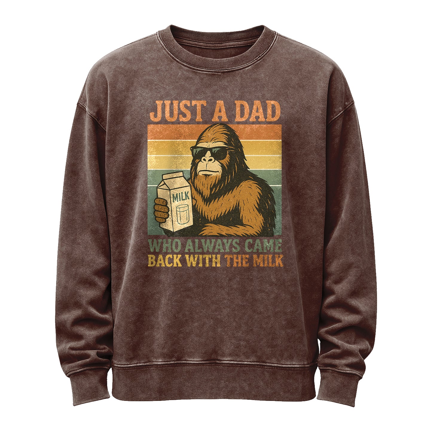 For the dads who deliver—milk included. This vintage-washed black sweatshirt features a retro sunset panel with a sunglasses-wearing Sasquatch holding a milk carton and the phrase “Just a Dad Who Always Came Back With the Milk.” Built from substantial 350g fleece (80% cotton / 20% polyester) for a soft, broken-in feel right out of the bag.