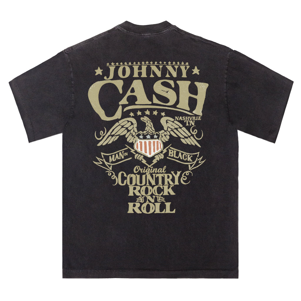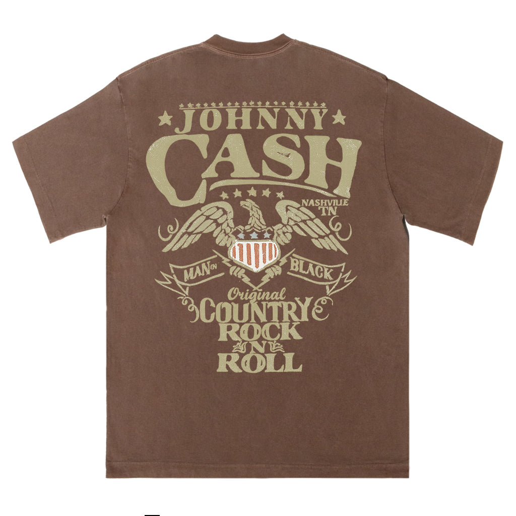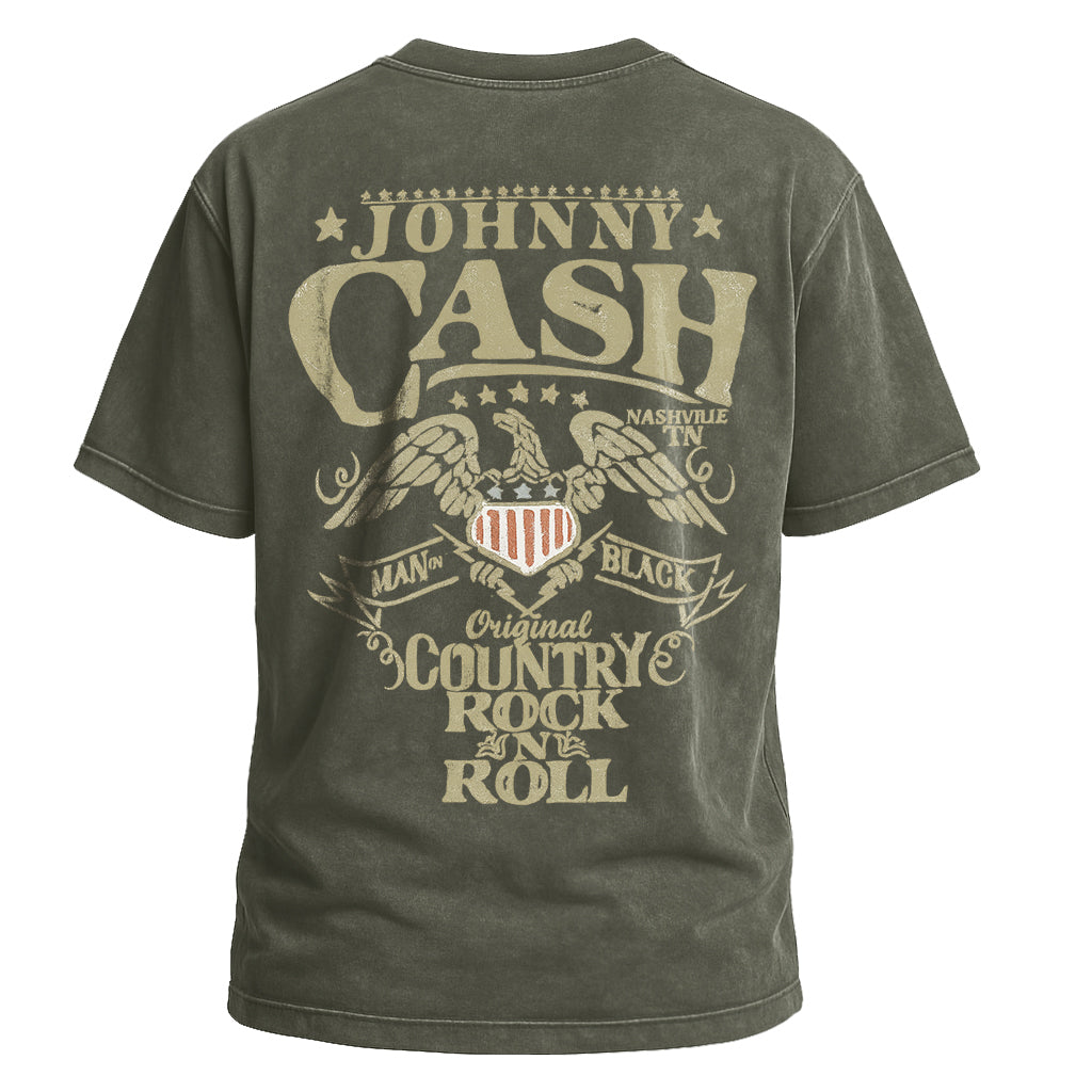 Rendi omaggio all'eredità dell'Uomo in Nero con la maglietta Johnny Cash Country Rock di LouMark. Questa maglietta marrone slavato presenta una grafica in stile vintage sul retro con un'aquila, stelle e la scritta in grassetto "JOHNNY CASH ORIGINAL COUNTRY ROCK & ROLL". Realizzata in cotone al 100%, offre un comfort classico e un'intramontabile tradizione musicale.