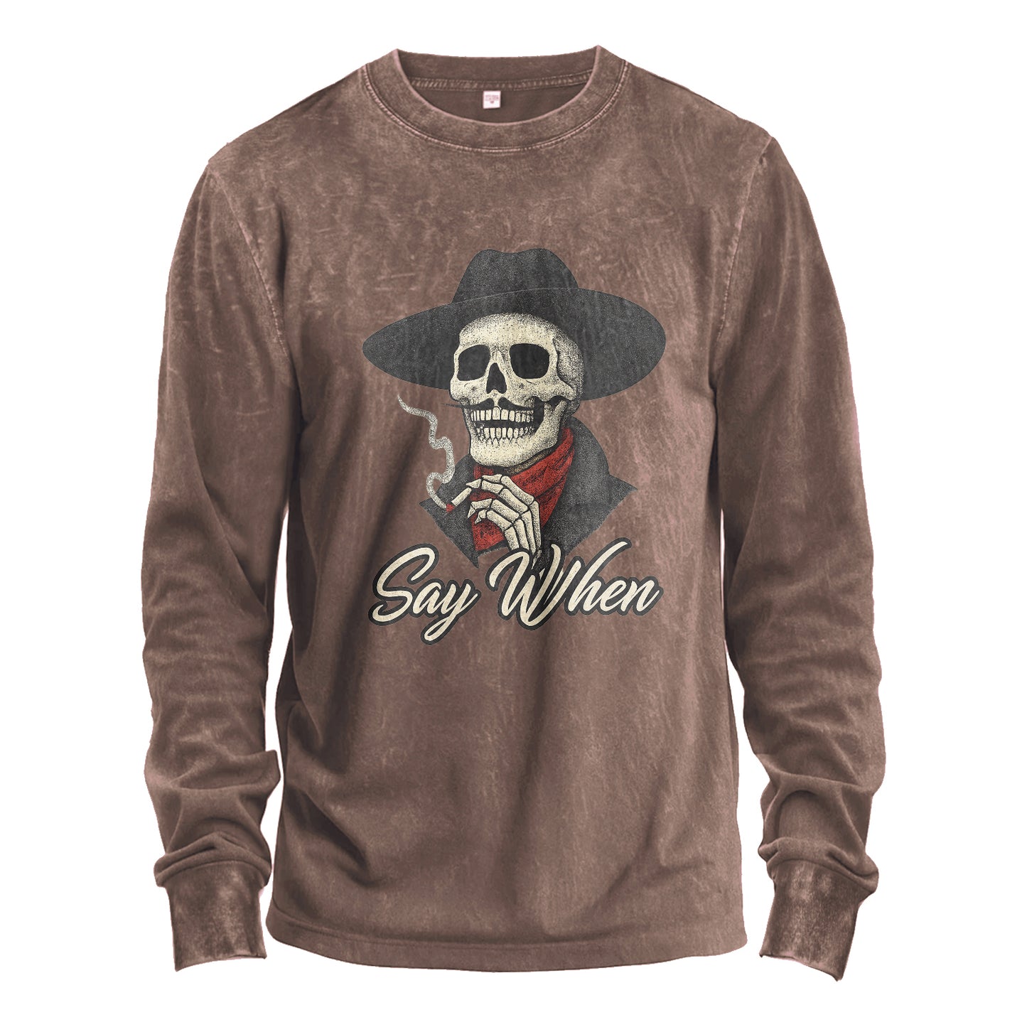 Grinta western con un sorriso. Questa maglia a maniche lunghe color oliva, con lavaggio vintage, presenta uno scheletro di pistolero fumante e la scritta "Say When". Realizzata in robusto cotone 100% da 230 g, offre una sensazione morbida e confortevole che dura a lungo.