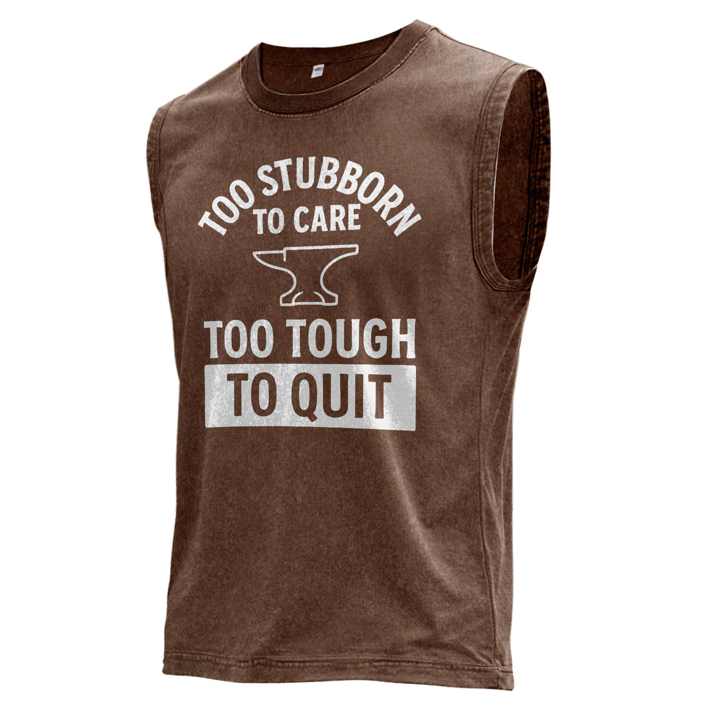Questa t-shirt vintage marrone è caratterizzata da una tipografia bianca audace e consumata: una scritta arcuata "TOO STUBBORN TO CARE" sopra un'icona a forma di incudine pulita, completata da un badge a blocchi con la scritta "TOO TOUGH TO QUIT".