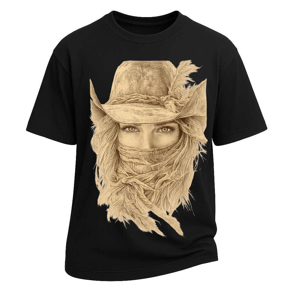 Mysterious, fierce, and unmistakably Western. The "Cowgirl Eyes" tee captures the essence of rugged femininity with a sepia-toned illustration of a veiled cowgirl staring straight through your soul. Printed on heavyweight 260g 100% cotton, this LouMark tee embodies both softness and grit. For those who ride with quiet strength and fearless beauty.
