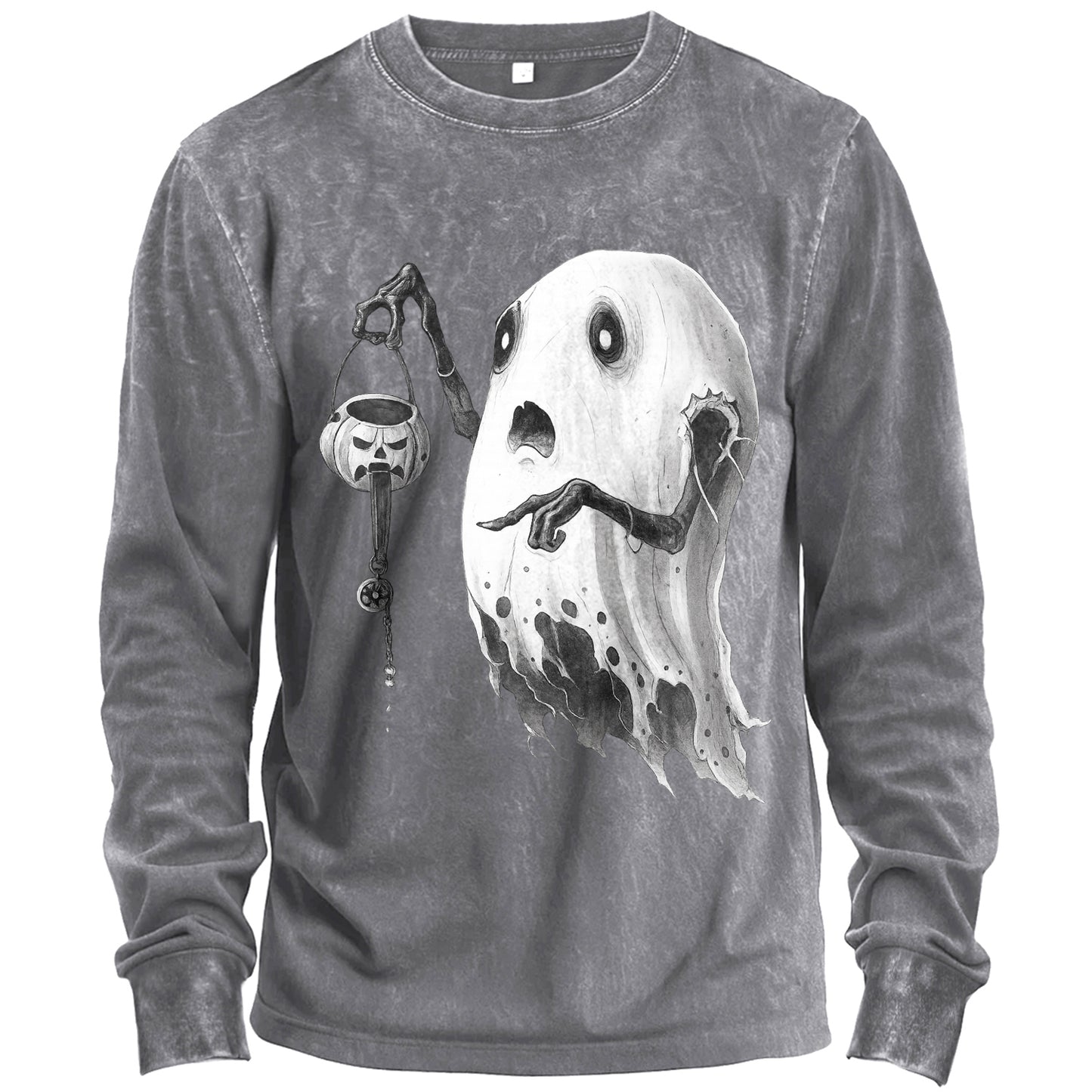 Hauntingly cozy. This vintage-washed army-green long-sleeve T-shirt features a grayscale ghost with skeletal arms, holding a dripping jack-o’-lantern lantern. Soft, breathable cotton with that broken-in feel from day one.