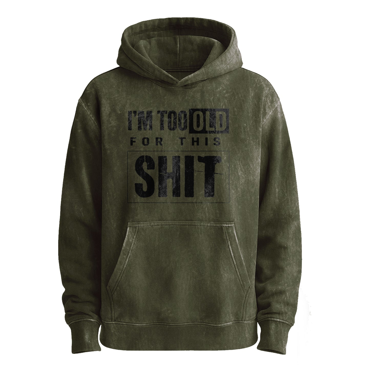 This vintage military green hoodie features oversized, distressed white typography: “I’M TOO” stacked over a boxed “OLD,” then “FOR THIS,” finished with a large outlined block reading “SHIT.”