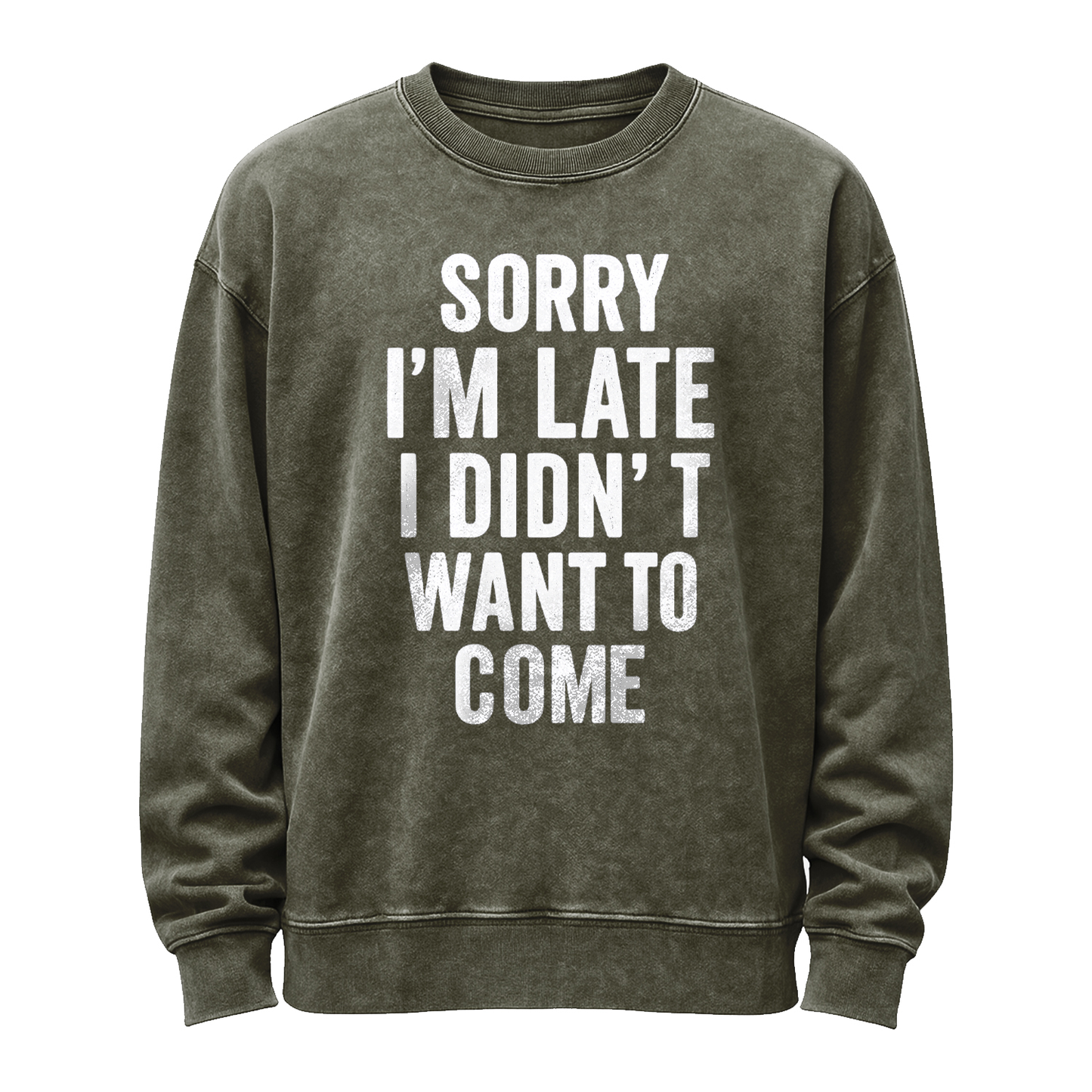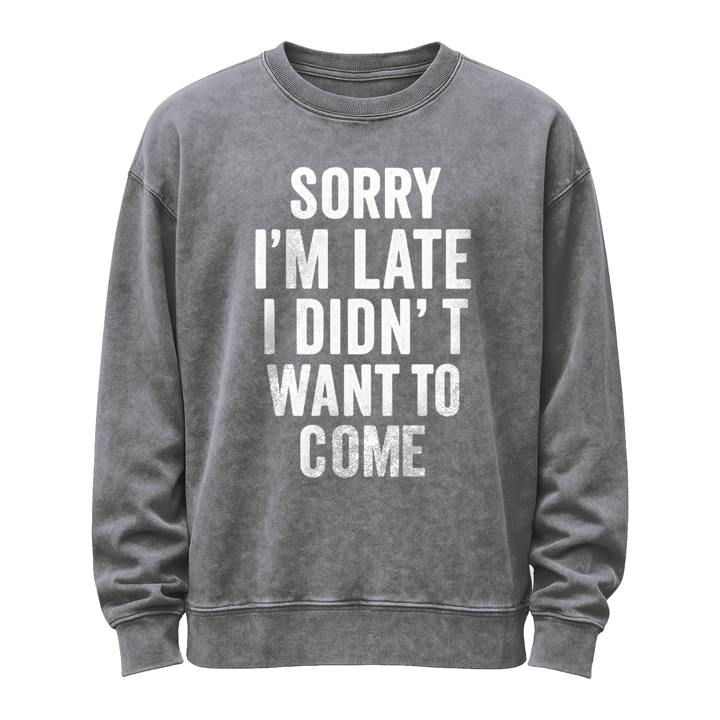 Honest, sarcastic, and comfy. This vintage-washed black sweatshirt features bold distressed white block text: “SORRY I’M LATE I DIDN’T WANT TO COME.” Built from substantial 350g fleece (80% cotton / 20% polyester) for a soft, broken-in feel right out of the bag.