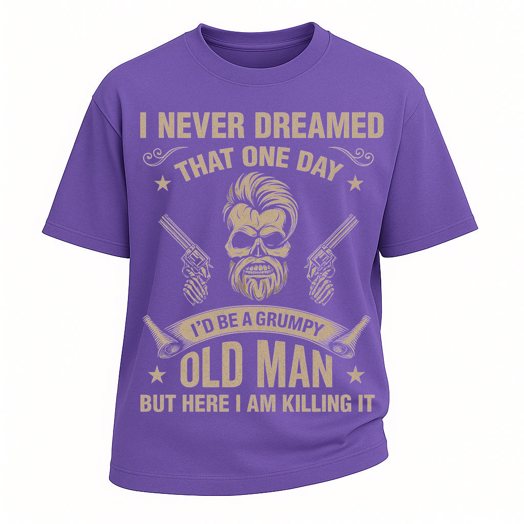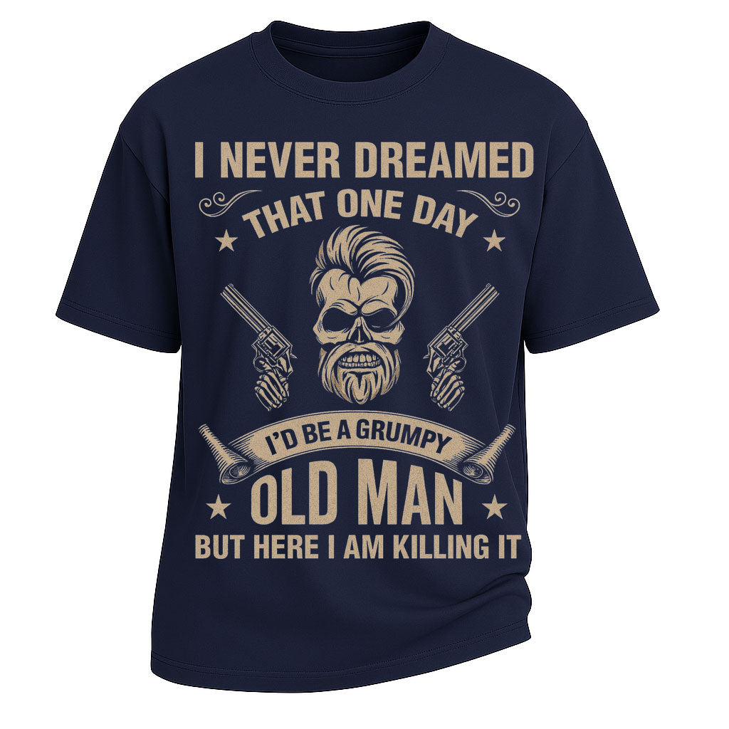 Embrace the humor of age with LouMark’s Grumpy Old Man Killing It Tee. Crafted from heavy 260G 100% cotton, this oversized T-shirt offers a relaxed fit with rugged durability. The design features bold lettering with the phrase “I NEVER DREAMED THAT ONE DAY I’D BE A GRUMPY OLD MAN BUT HERE I AM KILLING IT,” flanked by pistols and a bearded skull graphic. A perfect mix of attitude, humor, and timeless character.