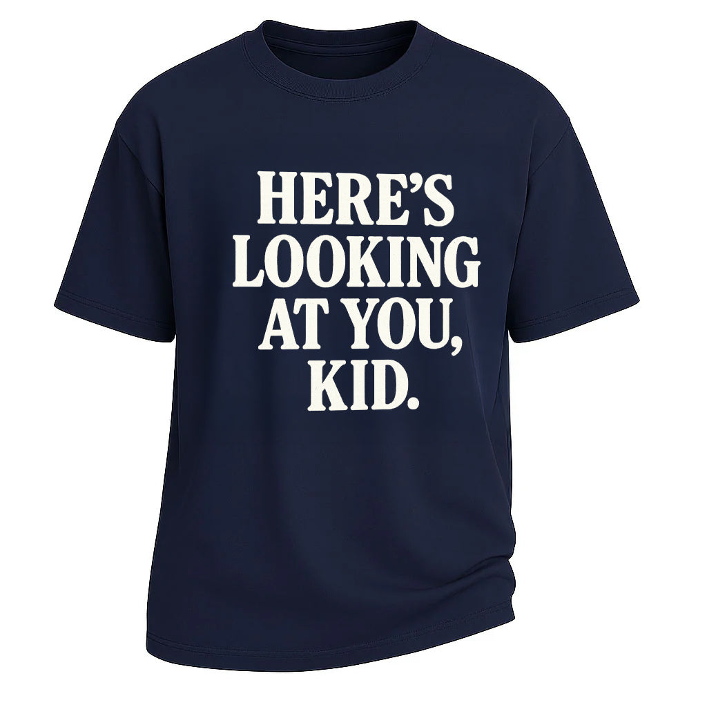Straight from Casablanca and onto your chest—LouMark’s “Here’s Looking at You, Kid.” tee captures timeless charm in a clean and iconic design. Set in vintage serif lettering, this olive-toned shirt pays homage to one of cinema’s most beloved lines. Whether you’re channeling old-school romance or classic cool, this tee is a wink to those who know that style, like good film, never goes out of fashion.