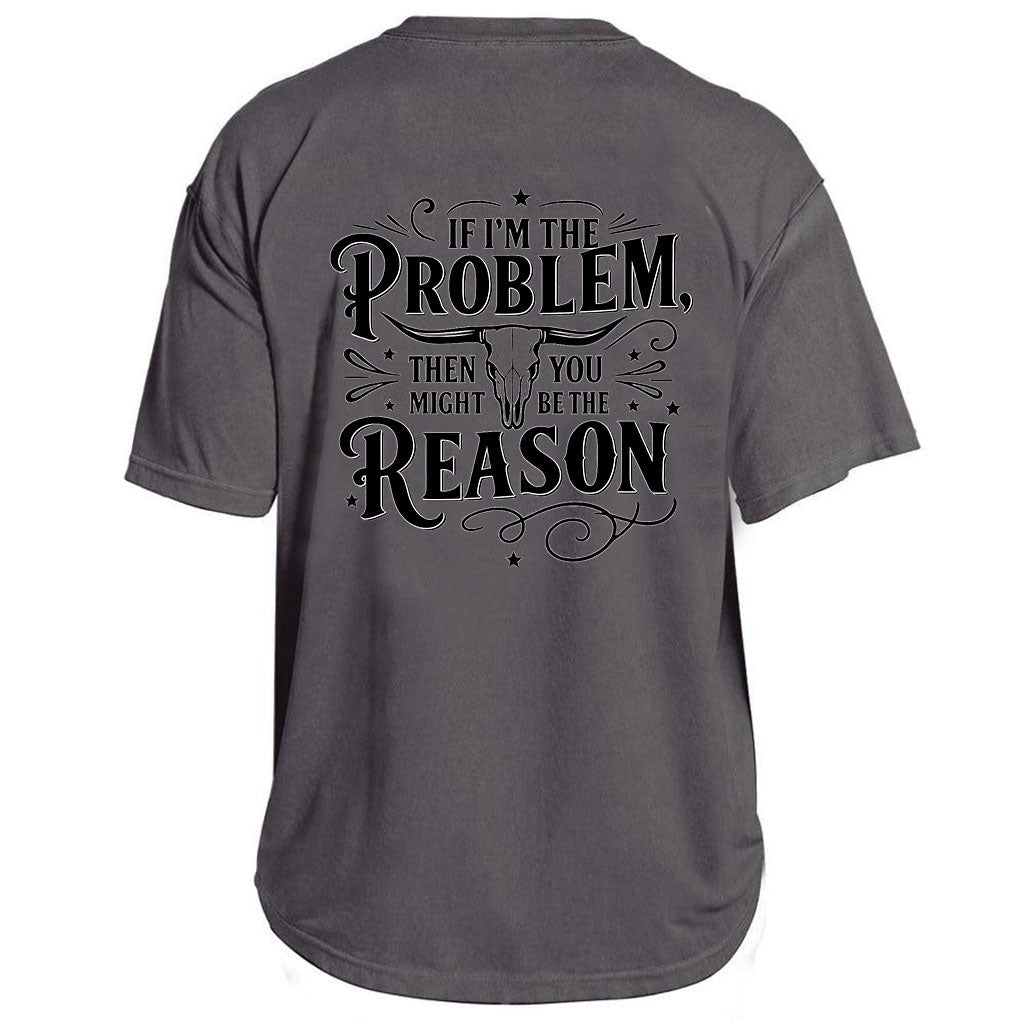 Assert your attitude in bold Western style with our “If I'm the Problem, Then You Might Be the Reason” tee. Featuring a striking double-sided design, the front bears the minimalist LouMark steer skull logo for authentic branding, while the back showcases an ornate Western script framed with longhorn horns and star accents. Made from a garment-washed cotton fabric for a soft, vintage feel, it’s the perfect shirt for those who aren’t afraid to speak their mind. Wear it under the wide sky or at the local bar—either way, the message is loud and clear.