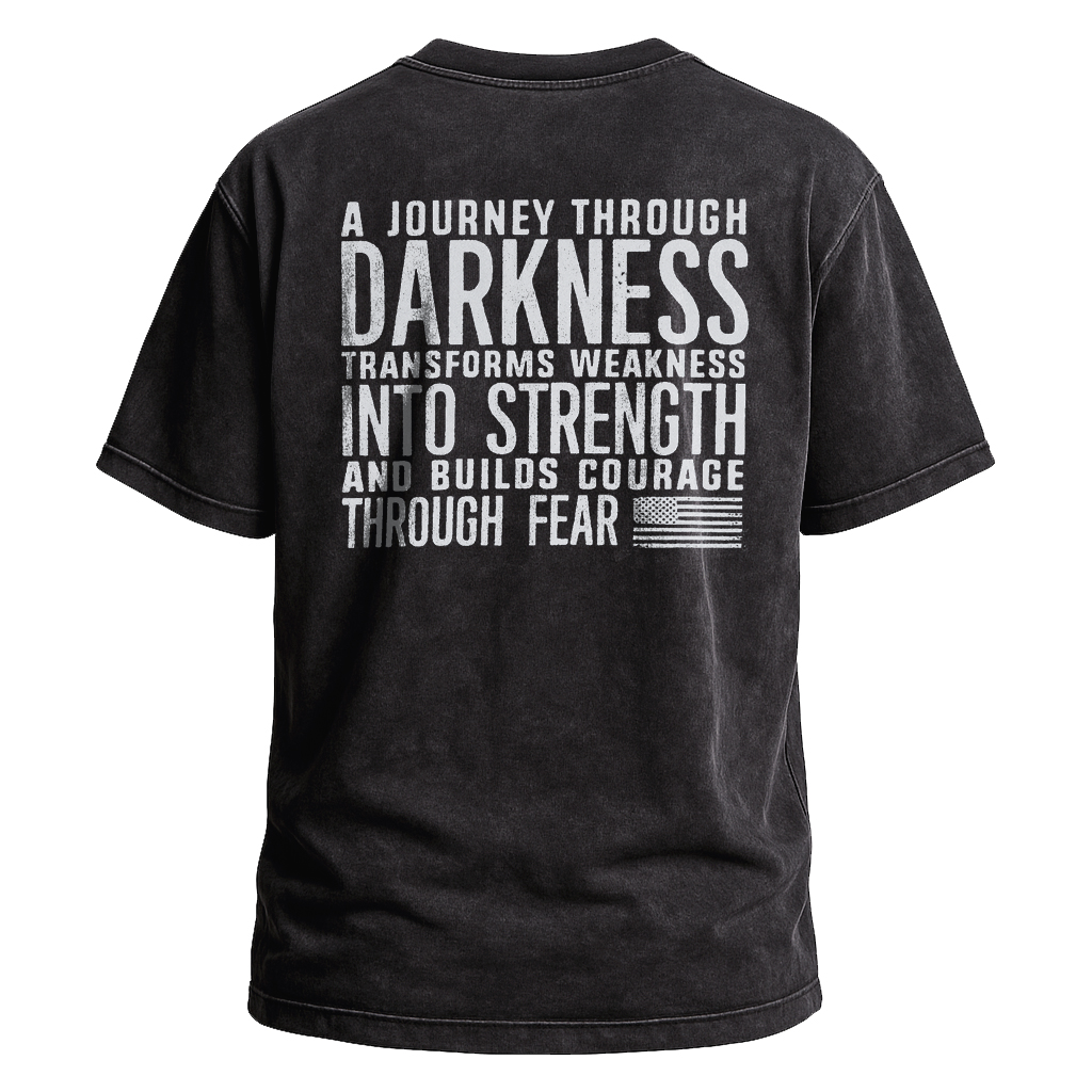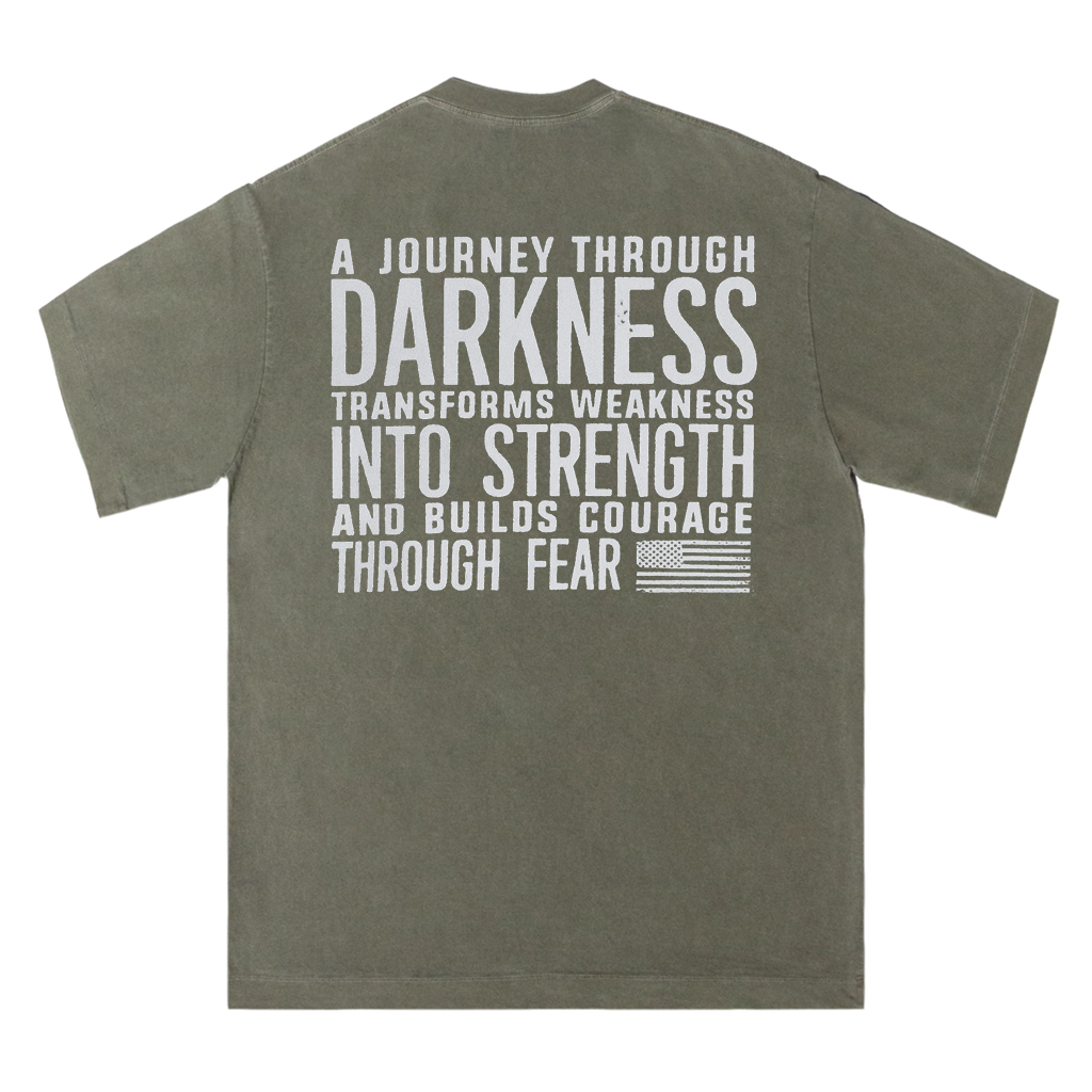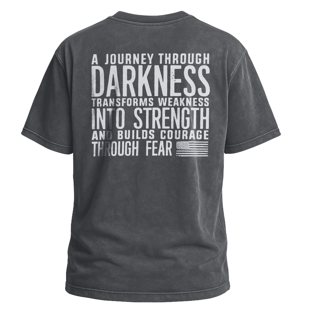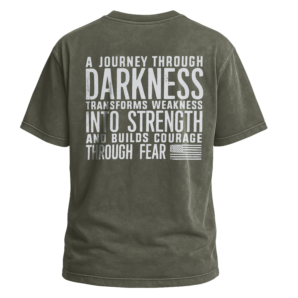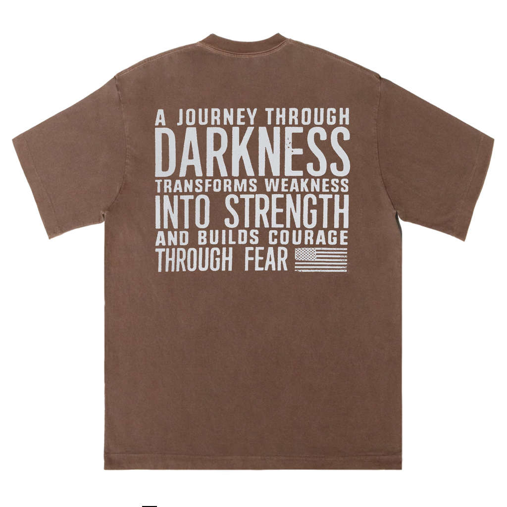 Embrace resilience with LouMark’s Journey Through Darkness Tee. This washed brown shirt features bold white typography on the back reading “A JOURNEY THROUGH DARKNESS TRANSFORMS WEAKNESS INTO STRENGTH AND BUILDS COURAGE THROUGH FEAR.” Made from 100% cotton for comfortable casual wear with an empowering message.