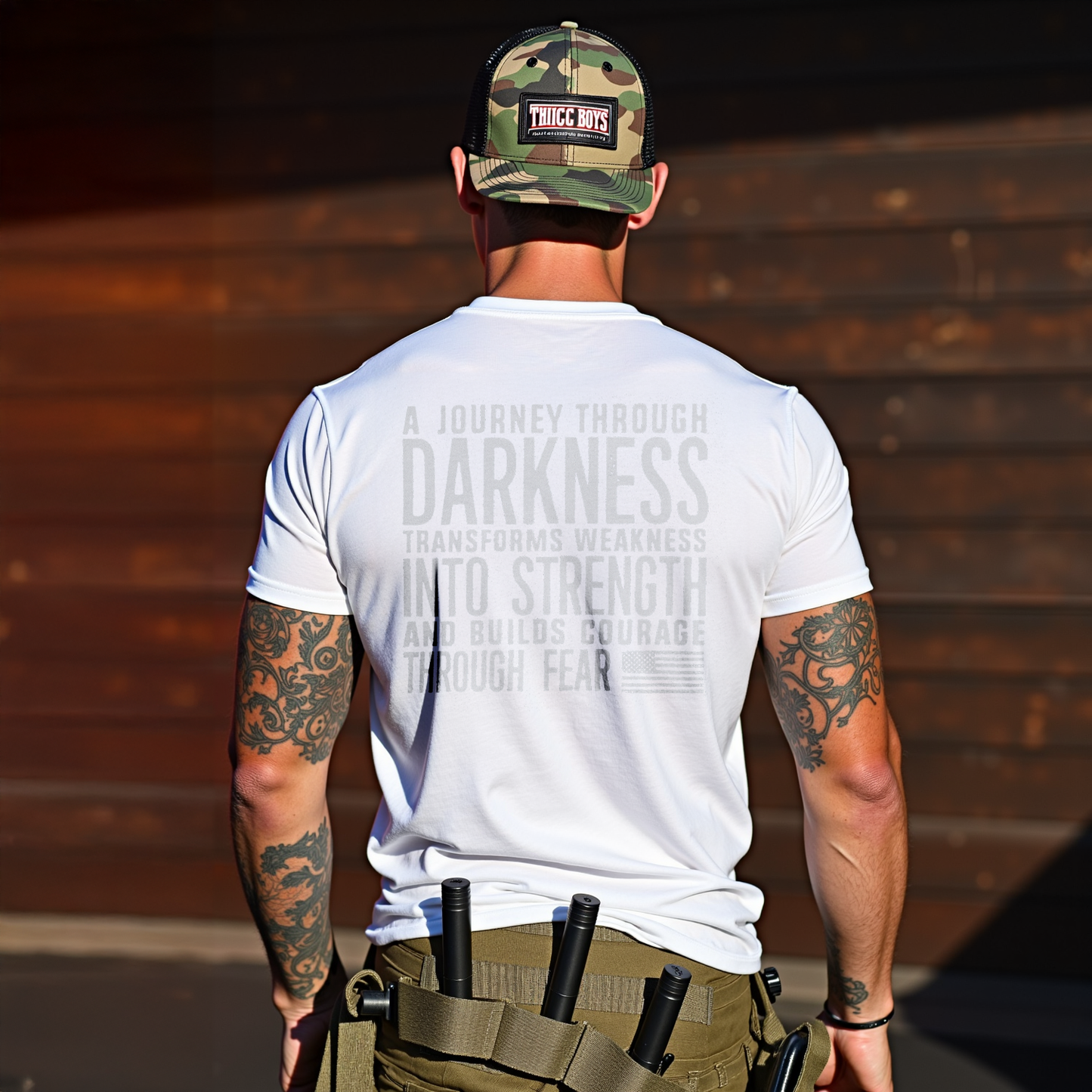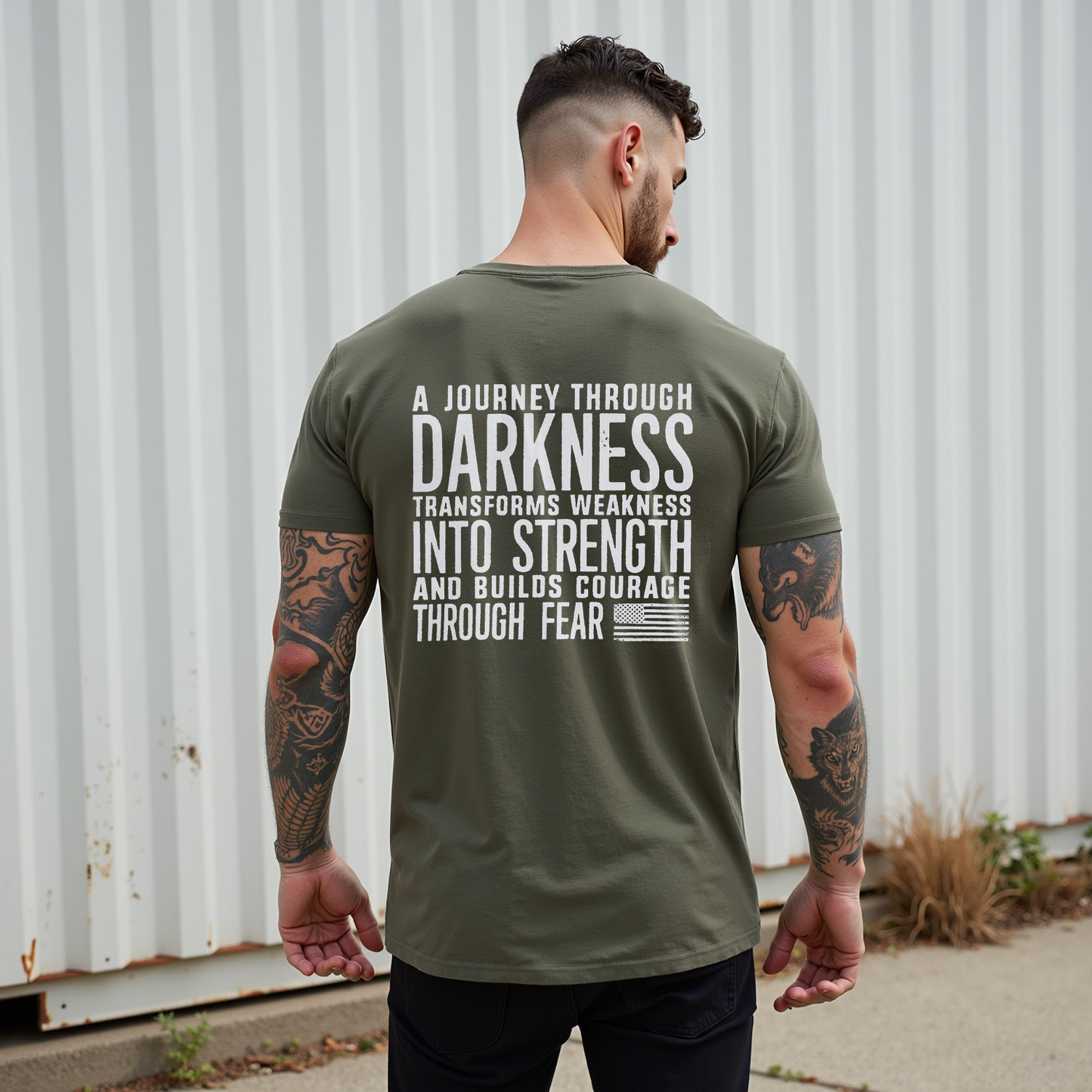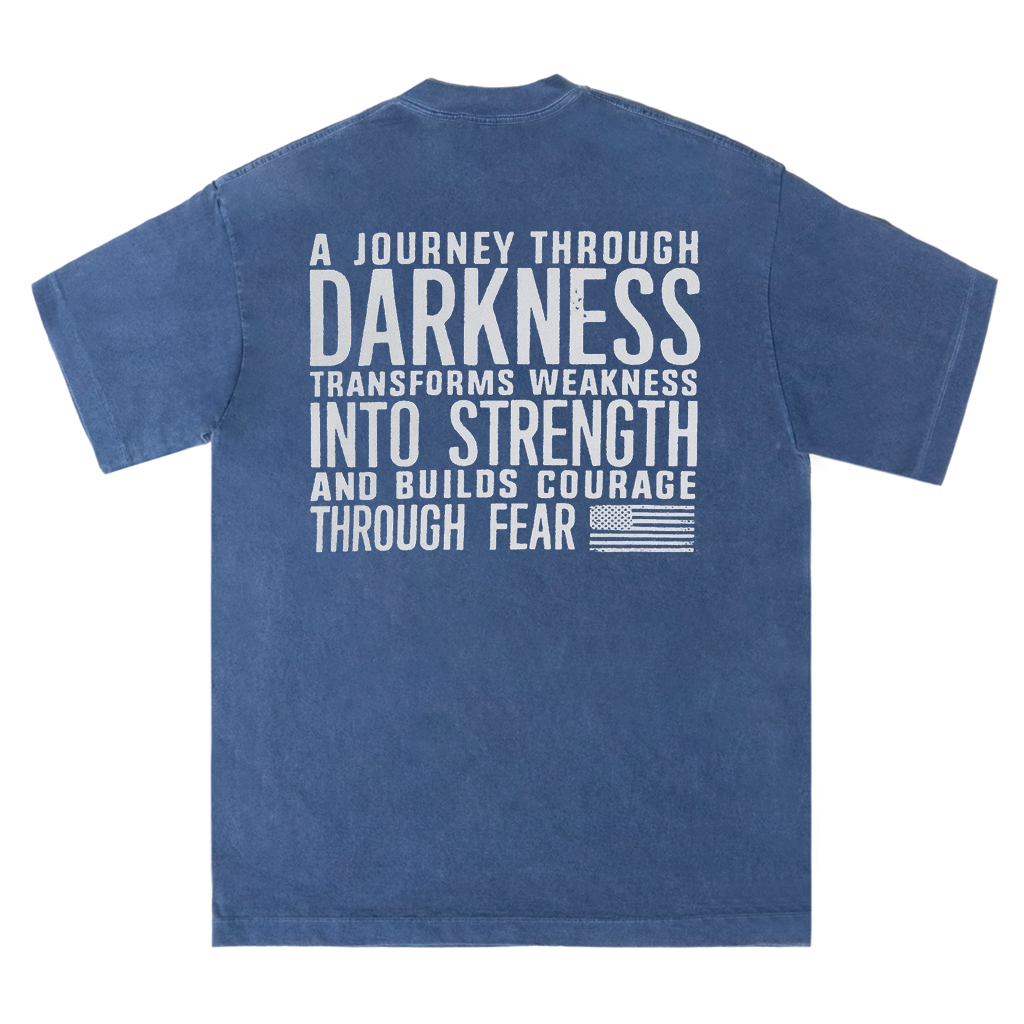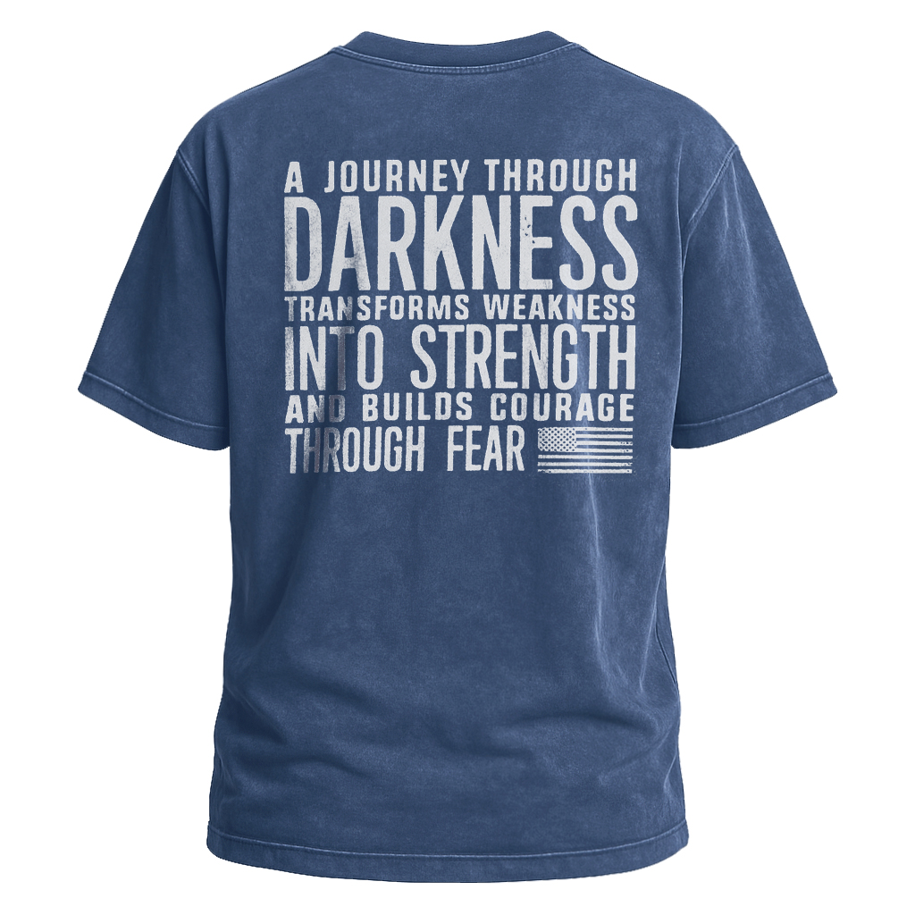 Embrace resilience with LouMark’s Journey Through Darkness Tee. This washed brown shirt features bold white typography on the back reading “A JOURNEY THROUGH DARKNESS TRANSFORMS WEAKNESS INTO STRENGTH AND BUILDS COURAGE THROUGH FEAR.” Made from 100% cotton for comfortable casual wear with an empowering message.
