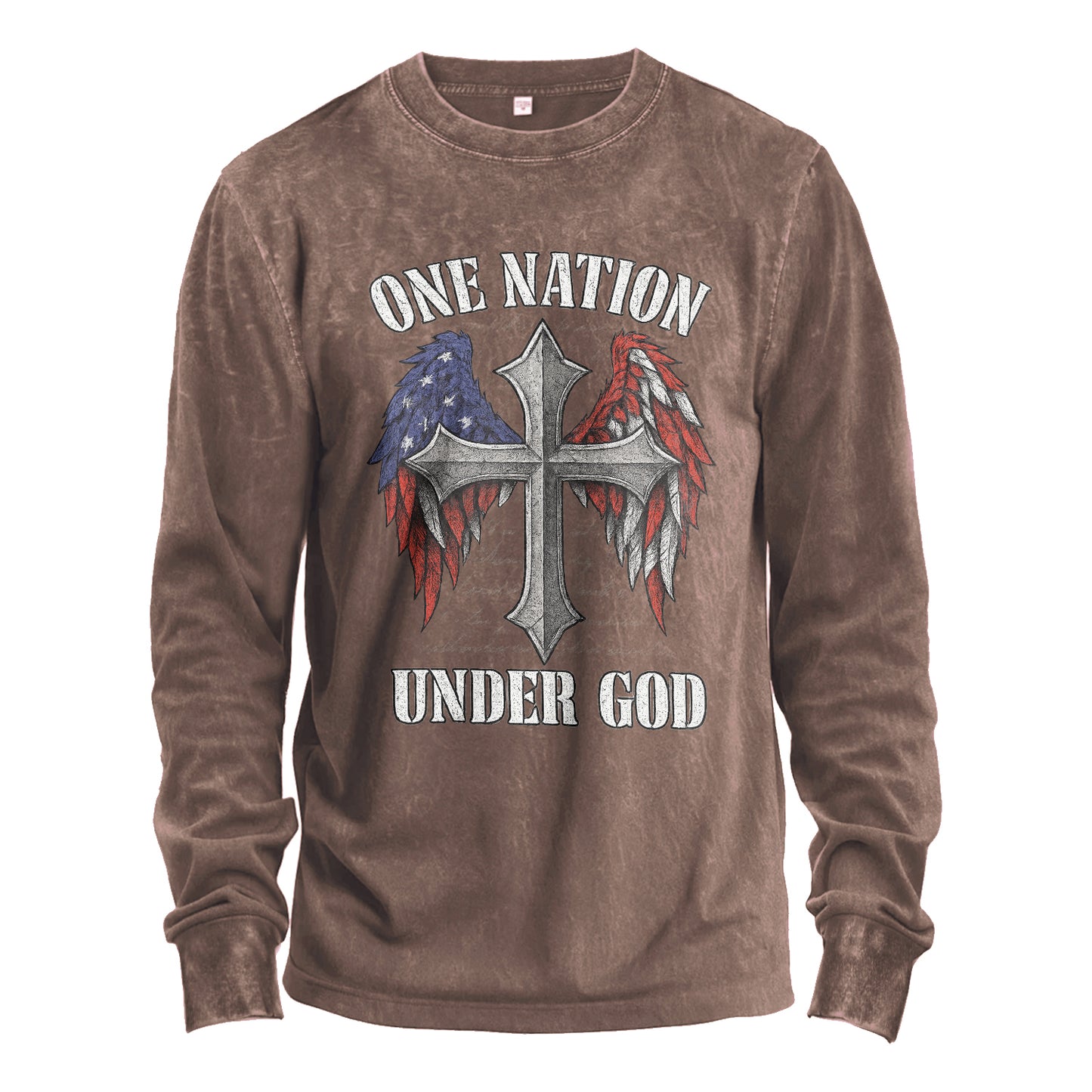 Stand for faith and country. This vintage-washed olive long sleeve features a bold cross flanked by American-flag feathered wings and the words “ONE NATION UNDER GOD.” Cut from hefty 230g 100% cotton, it’s soft from day one and built to last.