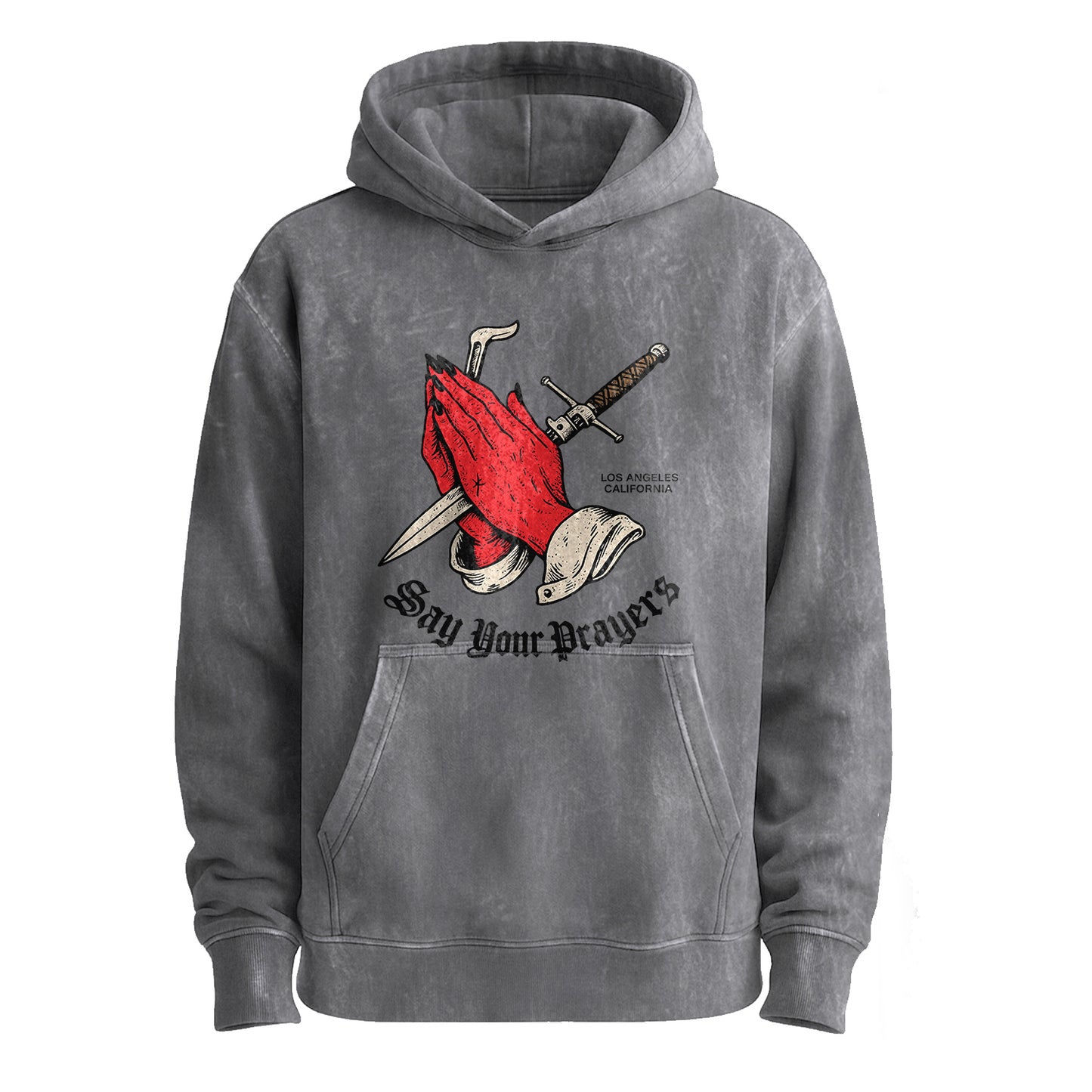 Gritty, reverent, and a little dangerous. This vintage-washed army-green hoodie features a striking graphic of red praying hands overlaid with a dagger and sword, finished in gothic script reading “Say Your Prayers.” Built from beefy 350g 100% cotton for a soft, broken-in feel the moment you put it on.