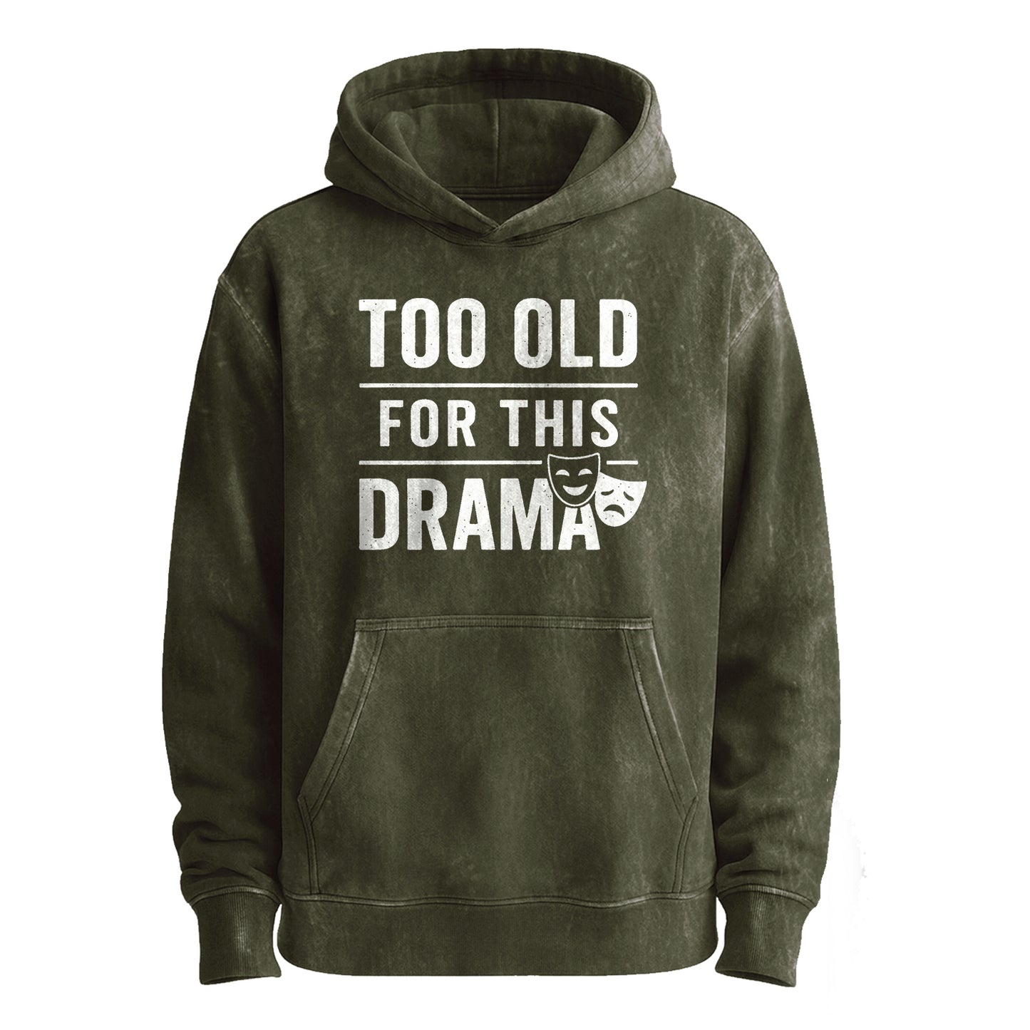 This vintage military green hoodie features oversized, distressed white typography reading “TOO OLD / FOR THIS / DRAMA,” separated by clean rules and paired with classic comedy–tragedy masks.